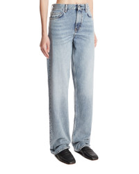 Toteme Blue Low Straight Jeans. Blue cotton denim, regular waist, five-pocket design, front button and zip closure. Straight-leg fit with a logo label on the back. Relaxed fit. Alicia is 173 cm and she is wearing size 26. DETAILS Model: 252WRB0270FB0423305 Composition: 100% Cotton Made in: ITALY Season: FW25-26