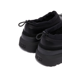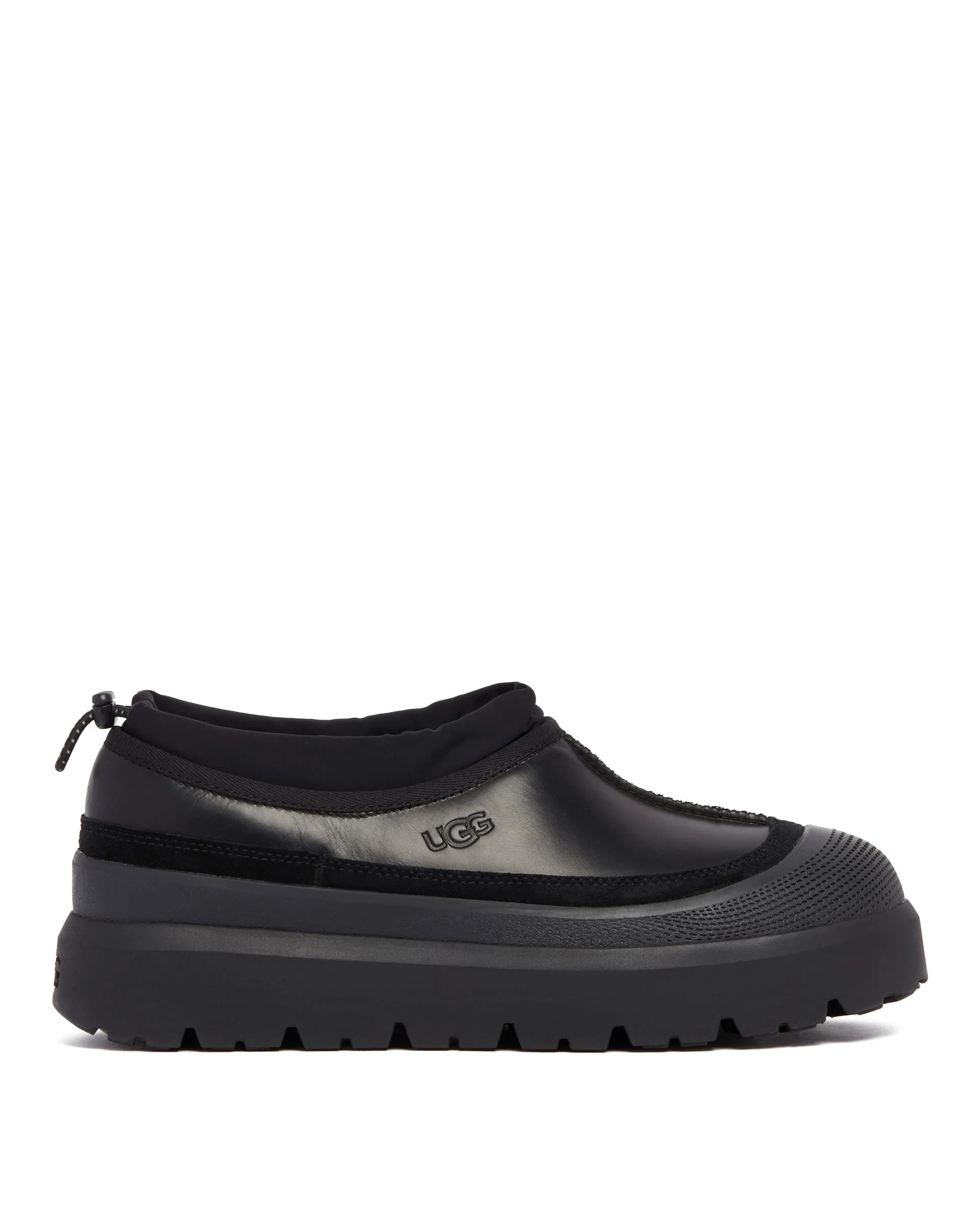 UGG Black Tasman Weather Hybrid Slippers. Black waterproof suede upper, elastic drawcord in recycled polyester and latex with stopper. Rounded toe, UGGplush lining, PU footbed with Spider Rubber inserts. EVA sole, embossed heat-stamped UGG logo, contrasting yellow fixed foam galosh. DETAILS Model: 1174251BBLC Composition: Upper: 80% Leather, 10% Rubber, 10% Fabric; Sole: 100% Rubber; Lining: 65% Wool, 40% Lyocell Made in: PHILIPPINES Season: FW25-26