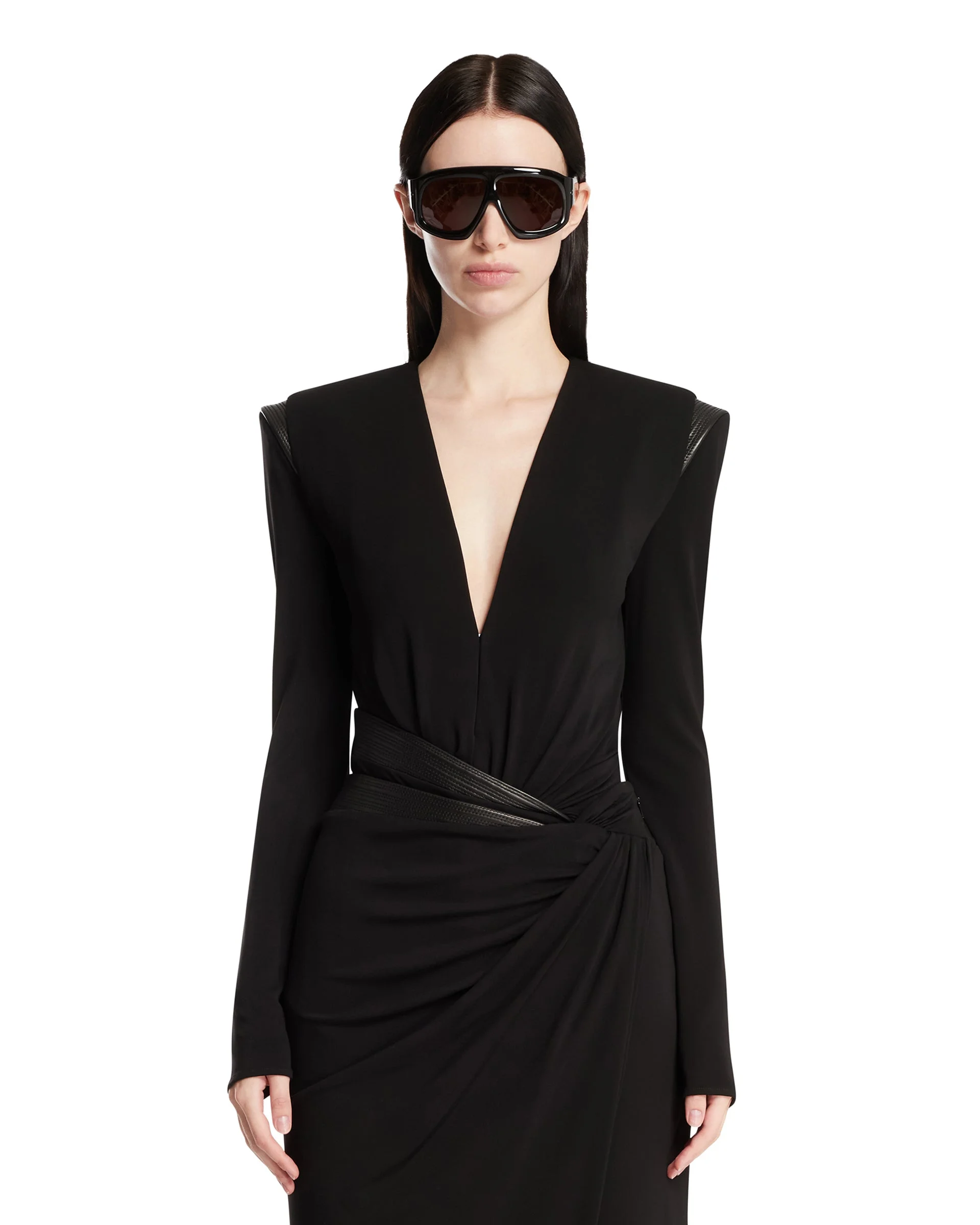 Versace Black V-Neck Bodysuit. Black stretch crepe jersey, V-neckline, long sleeves, hidden back zip closure, hook-and-eye fastening. Defined padded shoulders, draped design, fitted silhouette. Janne is 179 cm and she is wearing size 40. DETAILS Model: 10219831A144751B000 Composition: 95% Viscose, 5% Elastane; Details: 100% Leather Made in: ITALY Season: FW25-26