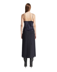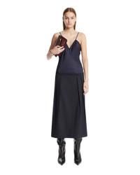 Victoria Beckham Blue Irina Midi Dress. Blue satin corset, V-neck, thin straps, straight hem, tone-on-tone wool-blend pleated skirt. Perla is 176 cm and she is wearing size 6. DETAILS Model: 1325WDR006443A3256 Composition: 71% Acetate, 29% Viscose; Details: 53% Polyester, 43% Wool, 4% Elastane Made in: PORTUGAL Season: FW25-26