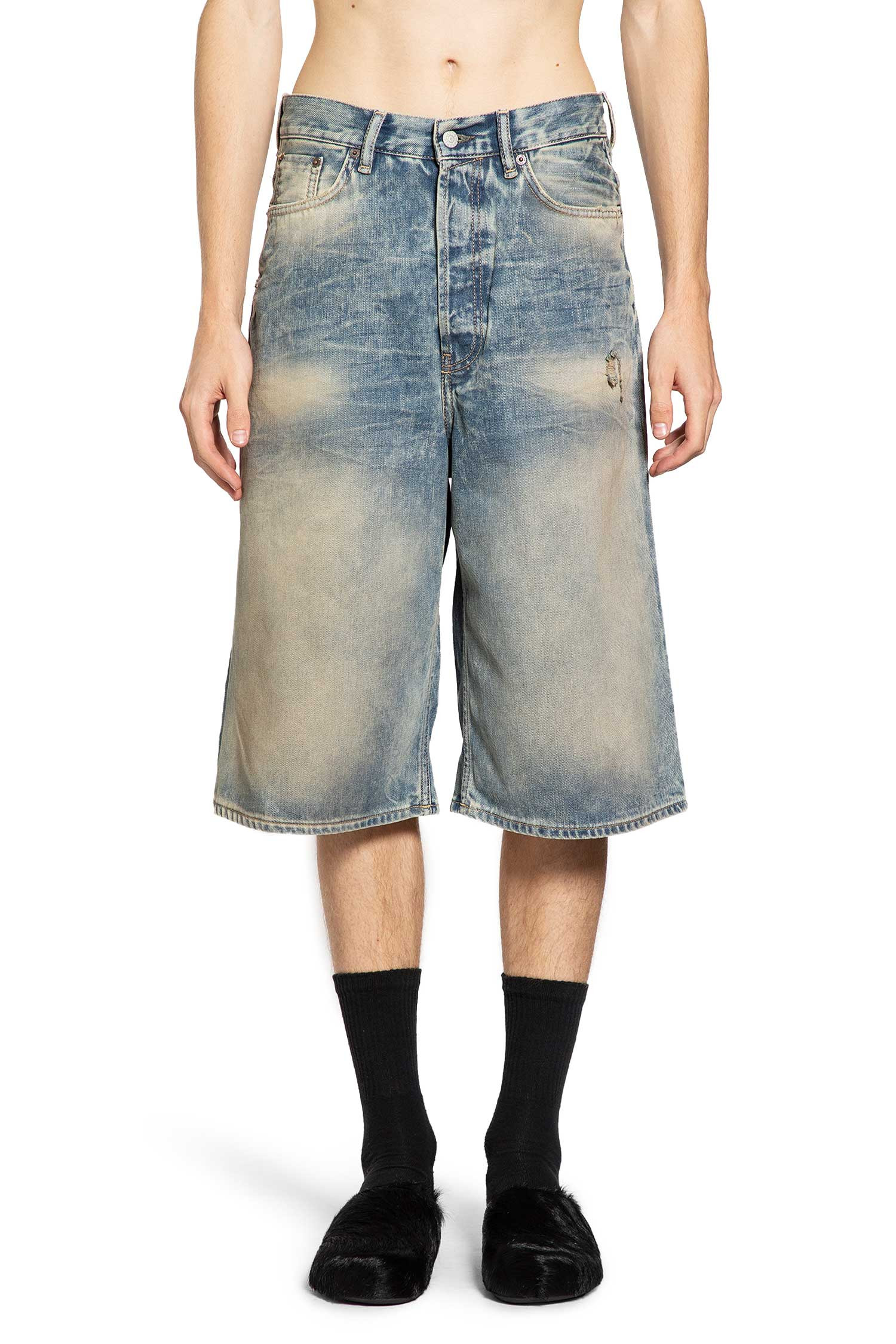 DESCRIPTION - Mid blue - Rigid cotton denim - Mineral dye - Irregular bleaching - Dirt mark details - Low-rise - Belt holes - Button closure - 5 pockets - Drop crotch - Back leather logo patch - Straight leg - Loose fit DETAILS - Made in: Italy - Composition: 100% Cotton - Model code: FNMNSHOR000293 AUZ - Item ID: 9837571965270