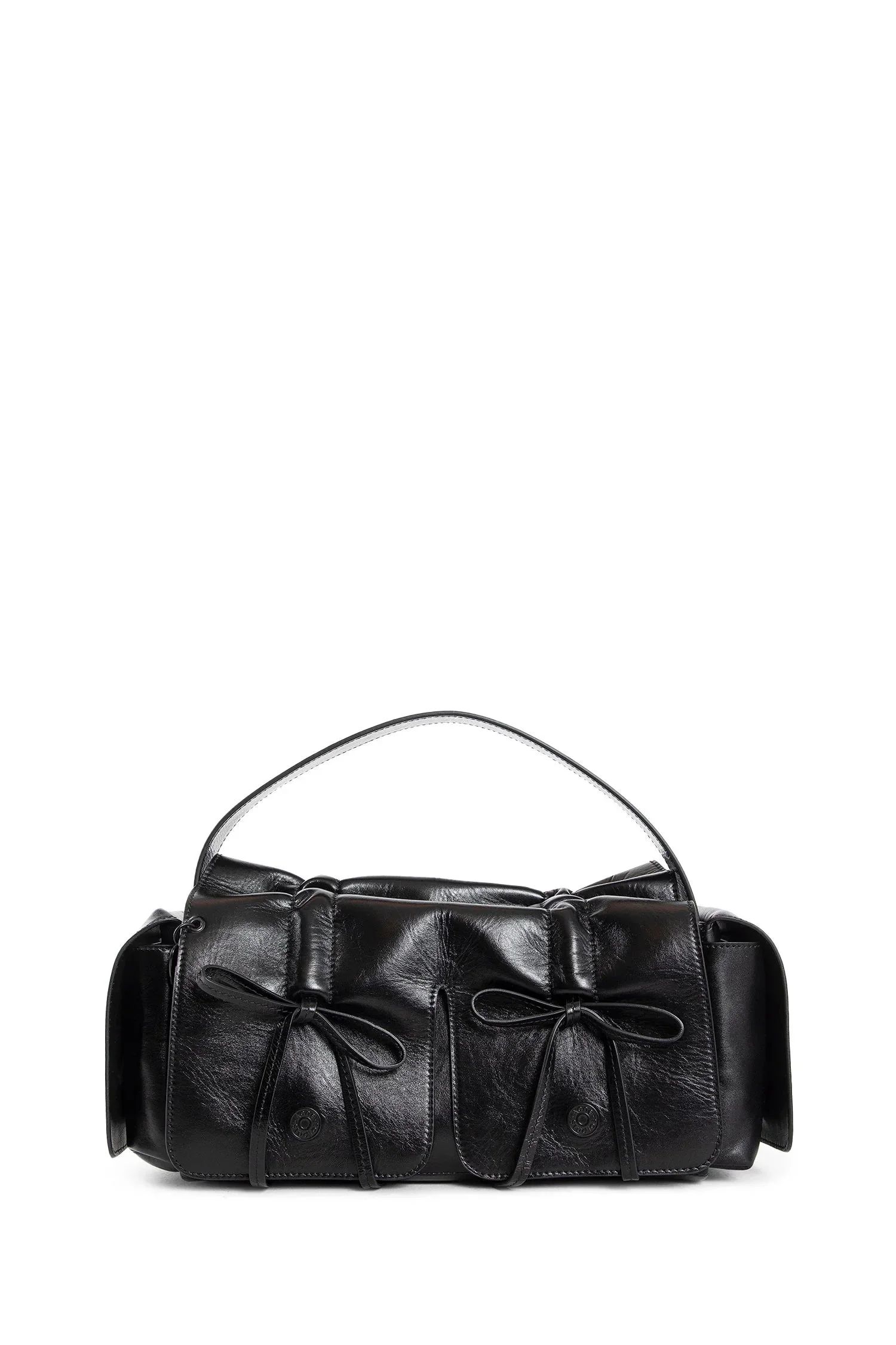 DESCRIPTION - Black - Shiny leather - Ruched flap with magnetic closure - Front leather bows - Front heart shaped pendant - Top handle - Adjustable and removable shoulder strap - Side flap pockets DETAILS - Made in: Italy - Composition: 100% Calfskin - Model code: A10432 900 - Item ID: 9373479633238