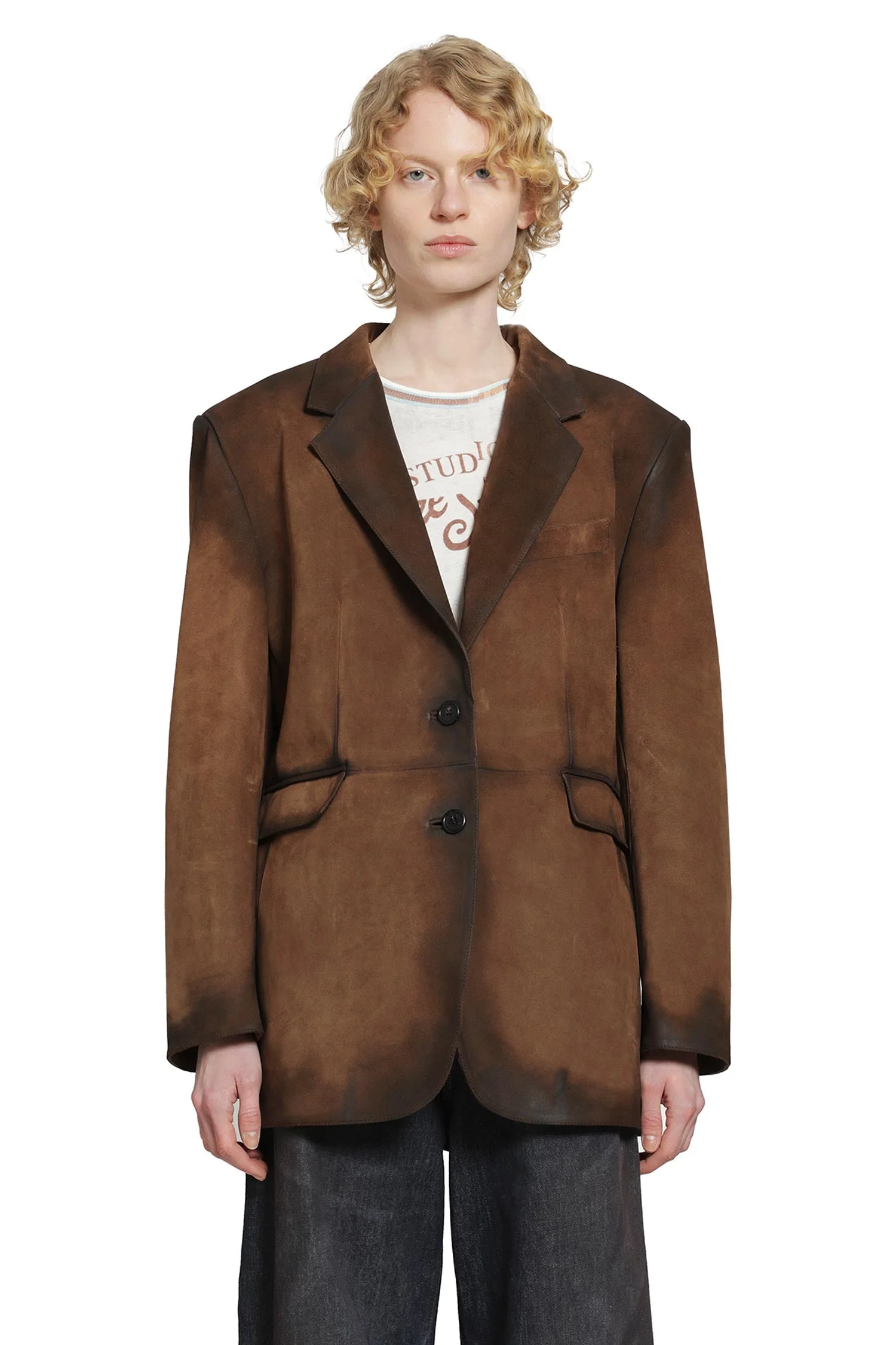Acne Studios delivers contemporary essentials with a cool, understated edge in this suede jacket. Crafted from smooth suede with worn edges for a lived-in look, it features a loose fit with exaggerated padded shoulders, notch lapels, and front pockets. Layer it over your outfits to add a polished, elevated touch.