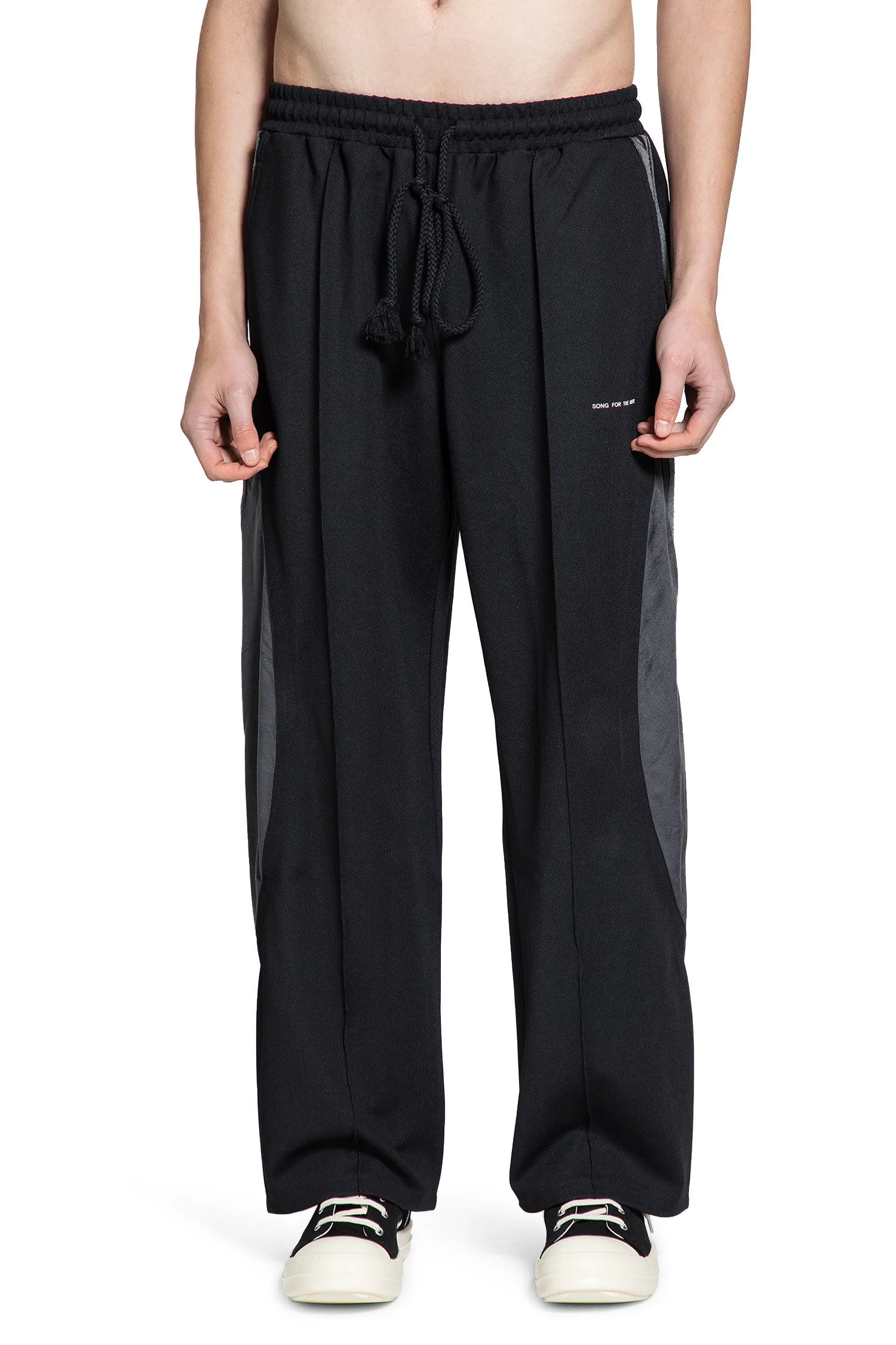DESCRIPTION - In collaboration with song for the mute - Multicolor - Black/grey - Diagonal stretch poly twill - Elastic waistband with fringed drawstrings - Front pleats - Fromt sftm logo embroidery - Side signature fleece 3-stripes - Back zipped pockets with fringed - drawstring cords - Straight fit - Wide leg DETAILS - Made in: China - Composition: 97% Polyester 3% Elastane - Model code: KC0323 BLACK - Item ID: 9831286112598
