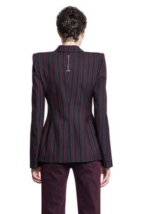 DESCRIPTION - Multicolor - Black/burgundy - Pinstriped - Single-breasted - Notch lapels - Button closure - Darted front and back - Side flap pockets - Padded shoulders - Buttoned cuffs - Back silver-tone chain t-bar logo - Fitted DETAILS - Made in: Italy - Composition: 100% Wool - Model code: 818381QJAEU 1314 - Item ID: 9331480297814 SIZE & FIT Model wears size 40 Model Height 178 cm Bust 85 cm Waist 73 cm Hips 92 cm