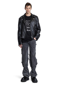 DESCRIPTION - Black - Stone washed denim - Belt holes - Asymmetric button and zip closure - 5 pockets - Self-tie leg straps - Back embossed logo leather patch - Flared leg DETAILS - Made in: Italy - Composition: 100% Cotton - Model code: 801174QYABB 1213 - Item ID: 9155475800406 SIZE & FIT Model wears size 48 Model Height 188 cm Chest 91 cm Waist 70 cm Hips 92 cm
