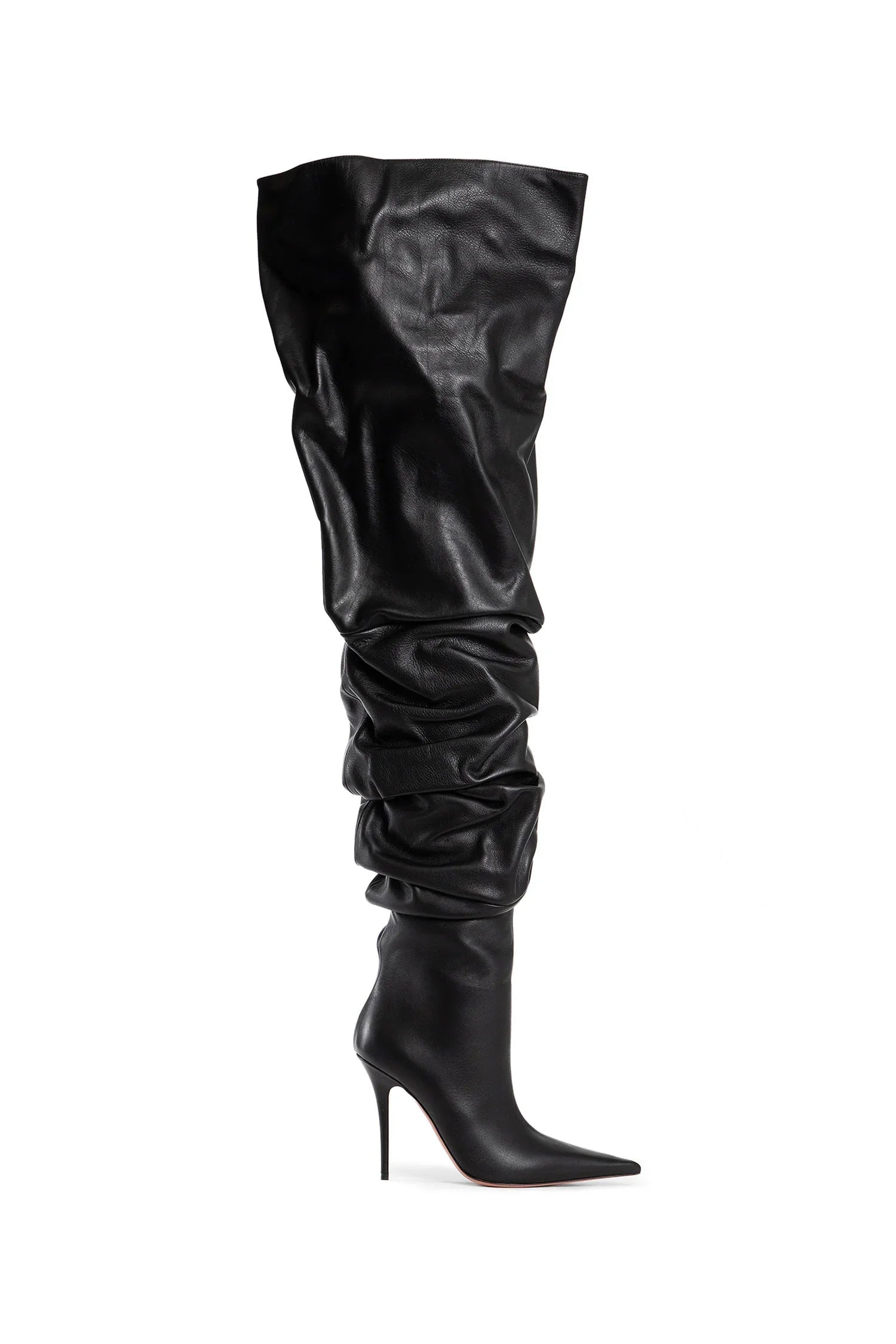 DESCRIPTION - Black - Slouched nappa leather - Pointed toe - Stiletto heel - Thigh high DETAILS - Made in: Italy - Composition: 100% Calfskin - Model code: ANOKTHIGHHIGHBOOT NAPPA BLACK - Item ID: 9337913049430