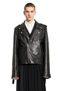 DESCRIPTION - black - vintage lux grained leather - notched collar - epaulettes - asymmetric zip closure - chest zipped pocket - front press stud flap pocket - side zipped pockets - dropped shoulders - side buckled waist straps - The fit of this item is oversized. Keep this in mind when choosing your size. Consider purchasing one size down. DETAILS - Made in: Italy - Composition: 100% Lambskin - Model code: B0012058LT137 099 - Item ID: 9046277062998 SIZE & FIT Model wears size 48 Model Height 188 cm Chest 91 cm Waist 70 cm Hips 92 cm