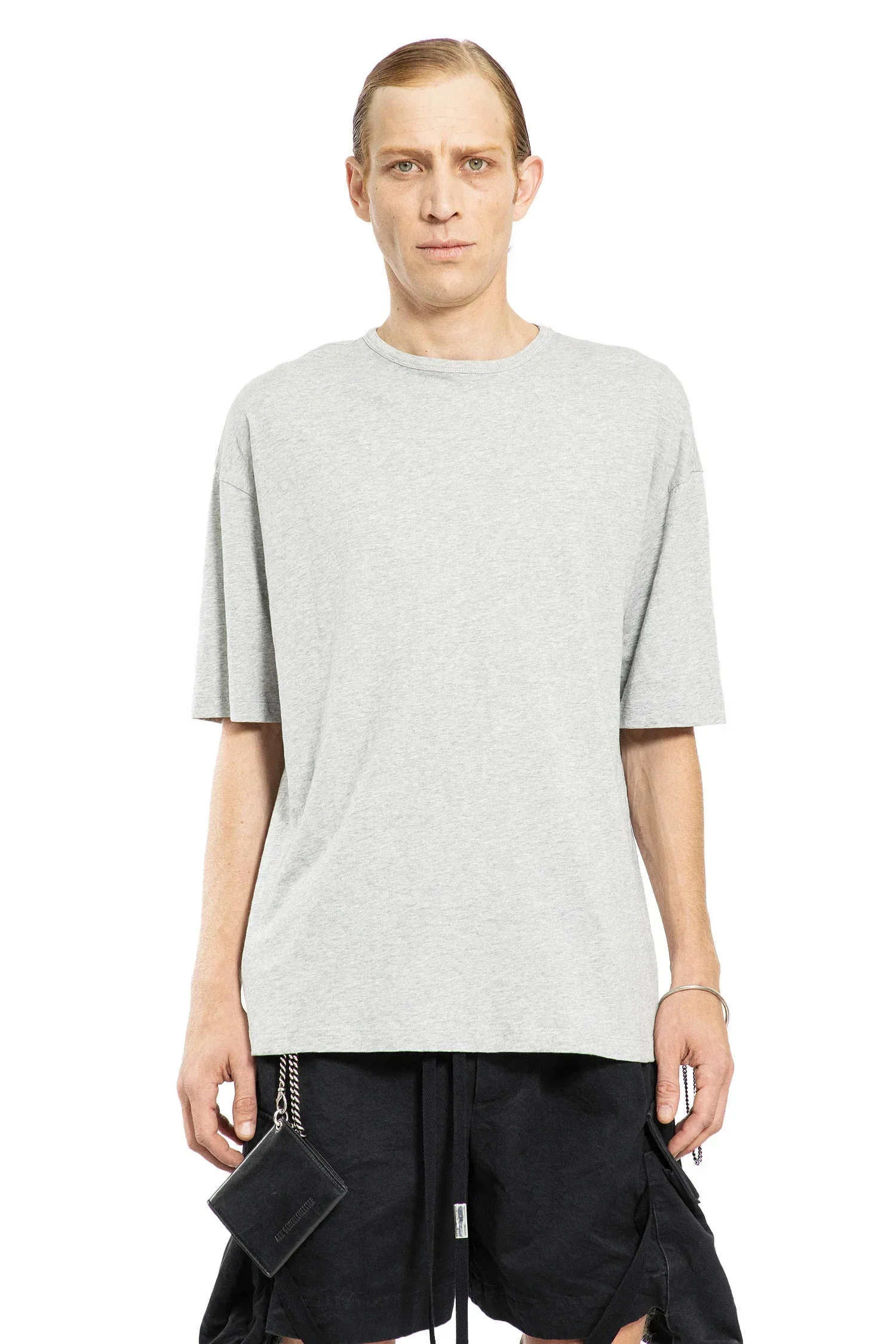 DESCRIPTION - Grey melange - Brushed cotton jersey - Round neck - Dropped shoulders - Short sleeves - Back ''sunset bleeding'' lyrics print - The fit of this item is oversize. If you prefer a narrow fit, consider purchasing this item two sizes down from your usual size. DETAILS - Made in: Portugal - Composition: 100% Cotton - Model code: B0012702FA226 070 - Item ID: 9364480754006 SIZE & FIT Model wears size M Model Height 186 cm Chest 88 cm Waist 74 cm Hips 93 cm