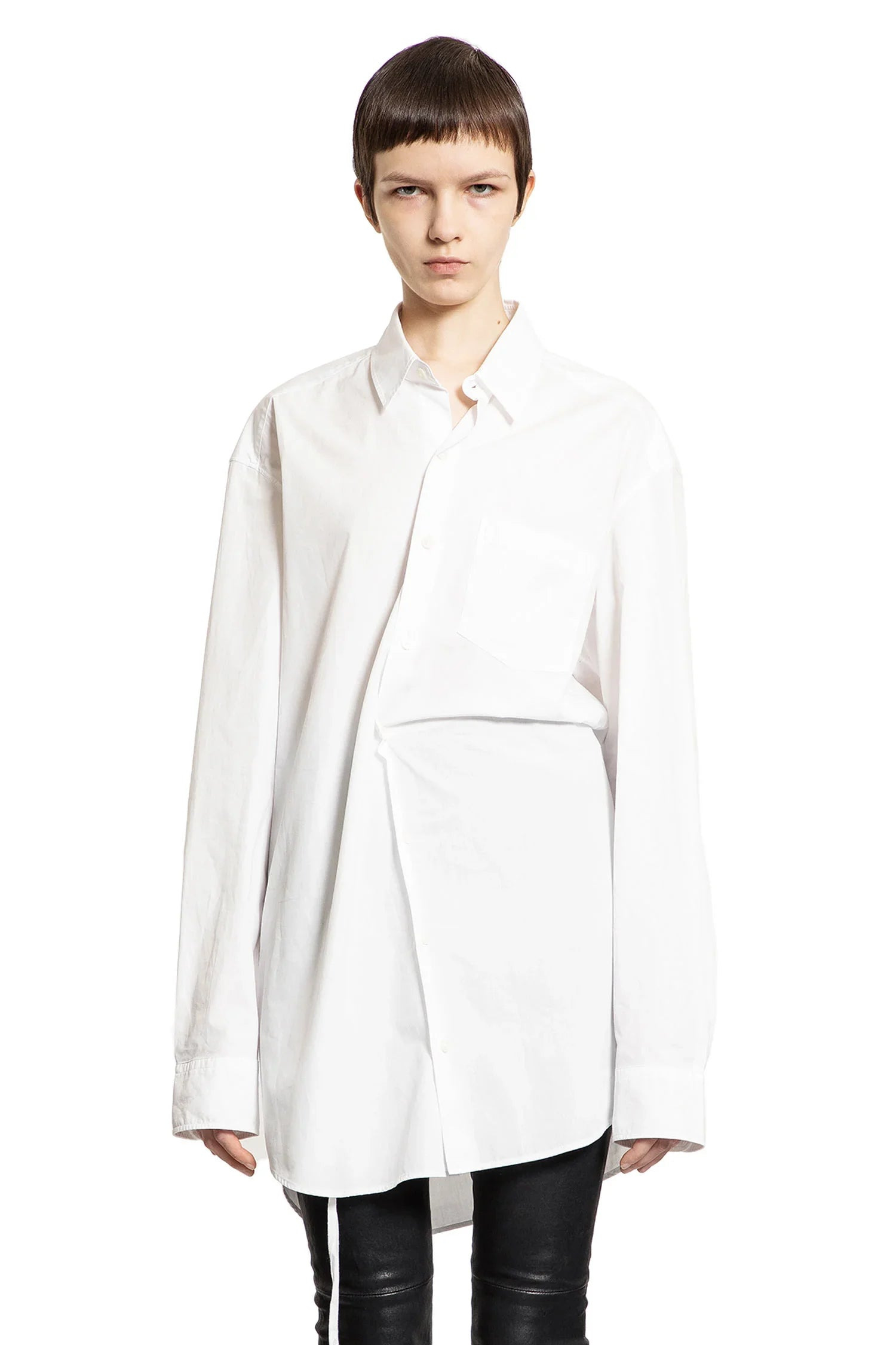 DESCRIPTION - white - cotton poplin - button closure - twisted front - dropped shoulders - long sleeves - asymmetric, elongated hem - The fit of this item is oversized. Keep this in mind when choosing your size. Consider purchasing two sizes down. - We recommend purchasing a larger size to utilize the waist s internal ribbon and achieve a draped effect. DETAILS - Made in: Italy - Composition: 100% Cotton - Model code: B0010219FA555 001 - Item ID: 9046311338326 SIZE & FIT Model wears size 40 Model Height 177 cm Bust 71 cm Waist 60 cm Hips 86 cm