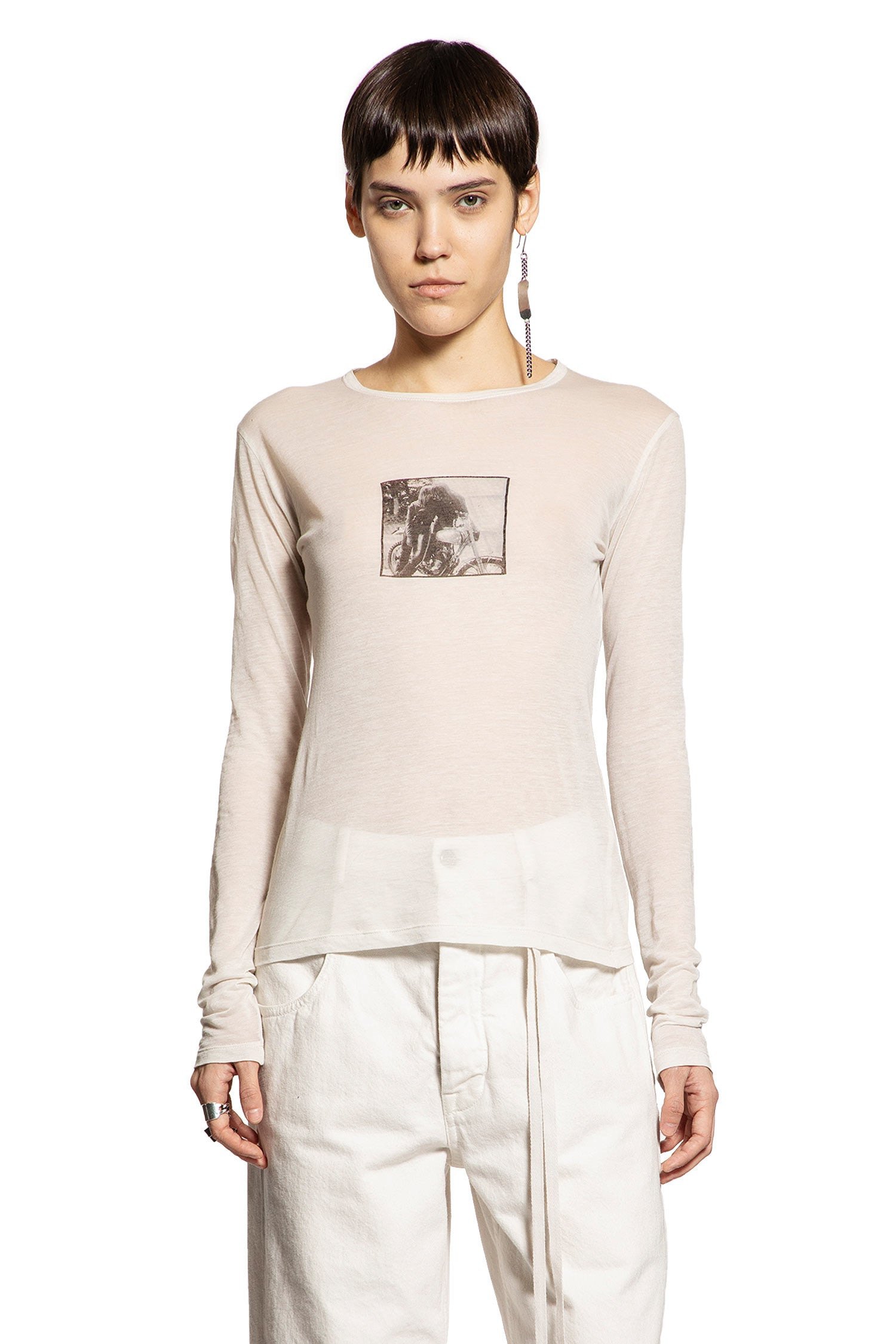 DESCRIPTION - Ivory - Sheer Light Cotton Jersey - Round Neck - Front ''Bikers Kiss'' Graphic Print - Dropped Shoulders - Long Sleeves - Slim Fit DETAILS - Made in: Portugal - Composition: 100% Cotton - Model code: B0013245FA119 003 - Item ID: 9780710310230 SIZE & FIT Model wears size S Model Height 178 cm Bust 85 cm Waist 60 cm Hips 90 cm