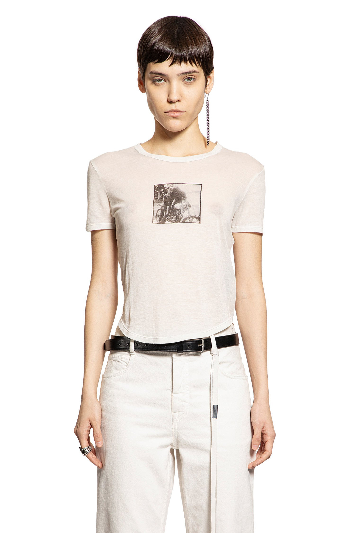 DESCRIPTION - Ivory - Sheer Light Cotton Jersey - Round Neck - Front ''Bikers Kiss'' Graphic Print - Dropped Shoulders - Curved Hem - Slim fit DETAILS - Made in: Portugal - Composition: 100% Cotton - Model code: B0013238FA119 003 - Item ID: 9780442923350 SIZE & FIT Model wears size S Model Height 178 cm Bust 85 cm Waist 60 cm Hips 90 cm