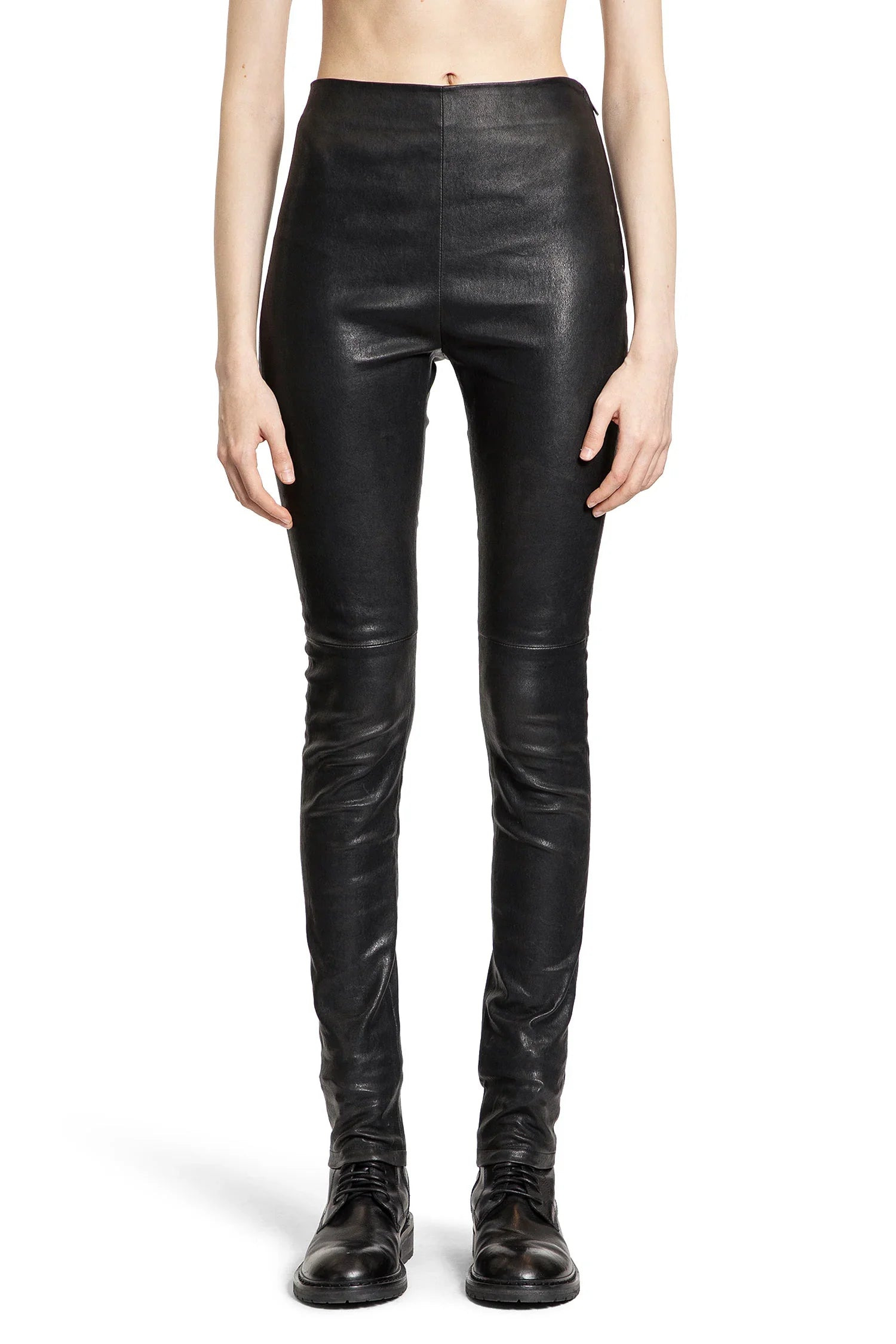 DESCRIPTION - Black - Stretch Nappa Leather - high-waisted - Fitted DETAILS - Made in: Italy - Composition: 100% Lambskin - Model code: B0010846LT084 099 - Item ID: 7436622725298 SIZE & FIT Model wears size 40 Model Height 177 cm Bust 71 cm Waist 60 cm Hips 86 cm