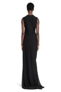 DESCRIPTION - Black - Silk georgette - Round neck - Twisted side - Sleeveless - Back diagonal teardrop button closure - Floor length - Draped - The fit of this item is regular. You may consider purchasing your usual size. DETAILS - Made in: Italy - Composition: 100% Silk - Model code: B0012534FA132 099 - Item ID: 9364470137174 SIZE & FIT Model wears size 36 Model Height 177 cm Bust 77 cm Waist 59 cm Hips 86cm