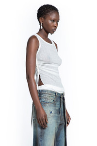 DESCRIPTION - Natural white - Sheer jacquard wool jersey - Scoop neck - Side ruched gathering - Racer back - Curved raw-edge hem - Cropped fit - Fitted DETAILS - Made in: Portugal - Composition: 80% Wool 20% Polyamide - Model code: B0011982FA619 002 - Item ID: 9750021439830 SIZE & FIT Model wears size S Model Height 177 cm Bust 74 cm Waist 58 cm Hips 85 cm