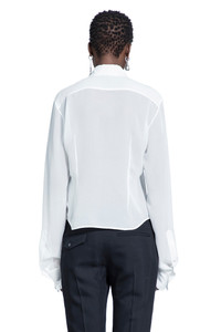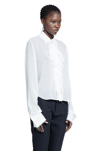 DESCRIPTION - Naural white - Georgette vap - Classic collar - Button closure with ruffled trim - Dropped shoulders - Elongated long sleeves - Buttoned cuffs - Darted back - Slim boxy fit DETAILS - Made in: Italy - Composition: 100% Silk - Model code: B0013461FA132 002 - Item ID: 9750023176534 SIZE & FIT Model wears size 38 Model Height 177 cm Bust 74 cm Waist 58 cm Hips 85 cm