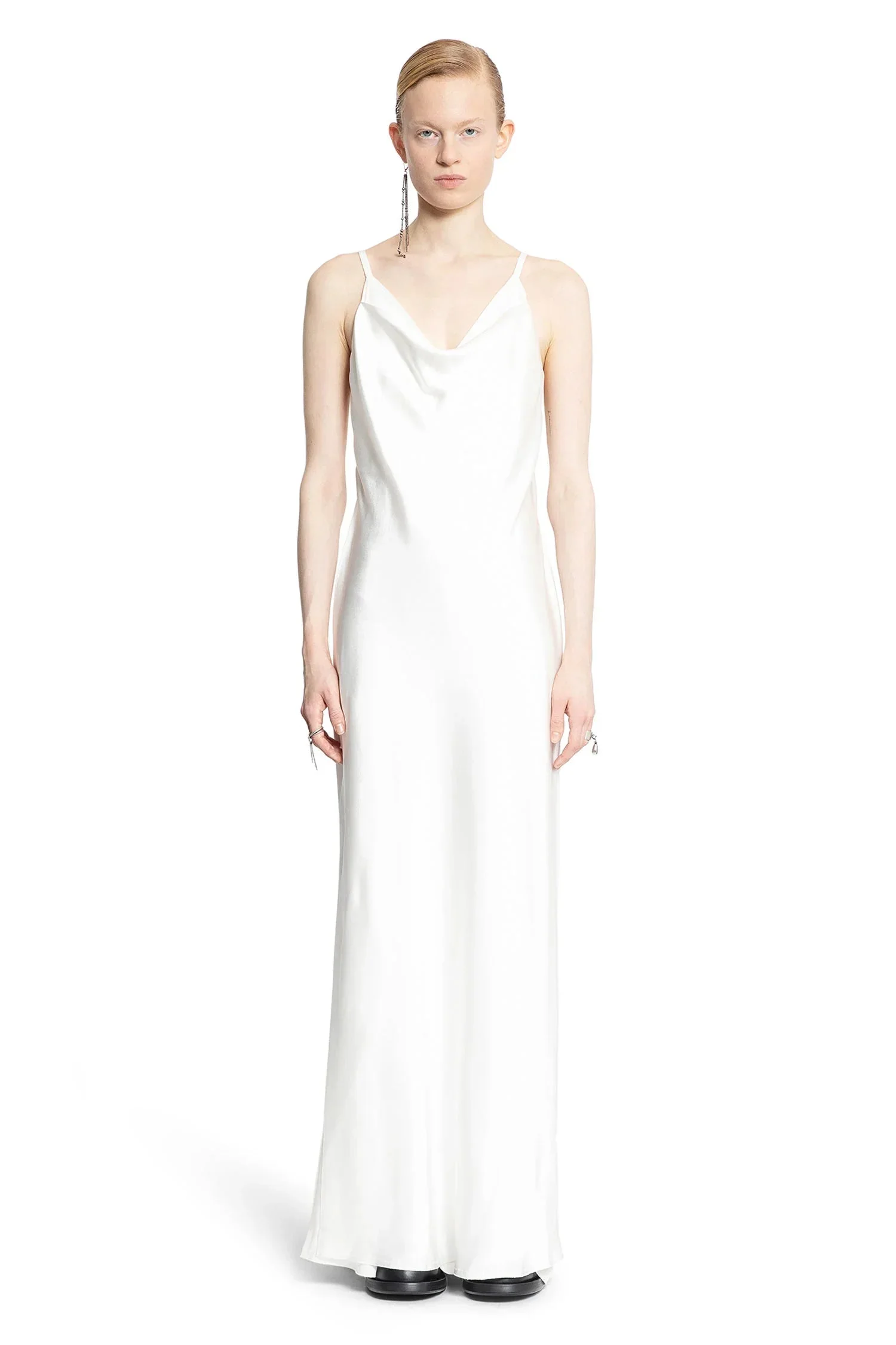 DESCRIPTION - Natural white - Satin - Cowl neckline - Sleeveless - Adjustable self-tie shoulders straps with engraved logo plaque - Open back - Cawl back - Floor lenght - Regular fit DETAILS - Made in: Italy - Composition: 57% Acrylic 43% Viscose - Model code: B0011968FA425 002 - Item ID: 9277022241110 SIZE & FIT Model wears size 40 Model Height 180 cm Bust 82 cm Waist 58 cm Hips 90 cm