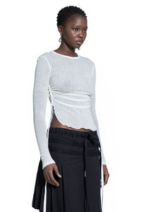 DESCRIPTION - Natural white - Jacquard wool jersey - Round neck - Side ruched gathering - Dropped shoulders - Long sleeves - Curved raw-edge hem - Cropped fit - Fitted DETAILS - Made in: Portugal - Composition: 80% Wool 20% Polyamide - Model code: B0012327FA619 002 - Item ID: 9785662308694 SIZE & FIT Model wears size S Model Height 177 cm Bust 74 cm Waist 58 cm Hips 85 cm