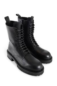 DESCRIPTION - Black - Grained shiny calfskin - Back signature rivet - Back pull tab - Lace-up closure - Side zip closure - Cleated rubber sole - Block heel DETAILS - Made in: Italy - Composition: 100% Cow Leather - Model code: B0013288LT141 099 - Item ID: 9689837273430