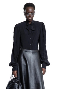 DESCRIPTION - Runway style - Black - Fluid technical Crepe - Wingtip collar with bow - Rounded shoulders - Button closure - Rounded long sleeves - Buttoned cuffs - Rounded hem - Slim fit DETAILS - Made in: Italy - Composition: 100% Polyester - Model code: 814140TRO21 1000 - Item ID: 9465275580758 SIZE & FIT Model wears size 38 Model Height 177 cm Bust 77 cm Waist 59 cm Hips 86 cm