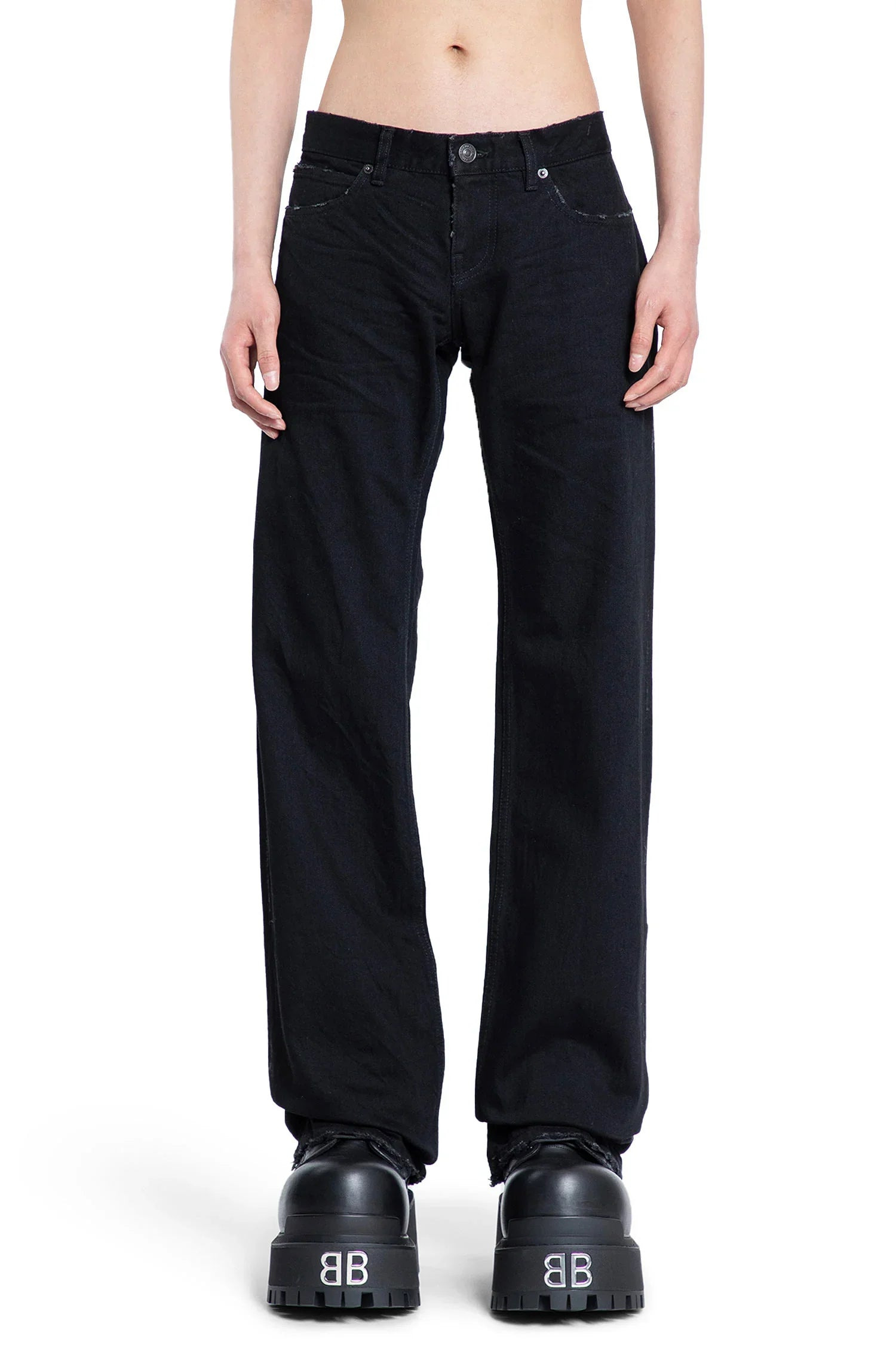 DESCRIPTION - Black - Distressed denim - Low-rise - Belt holes - Button and zip closure - 5 pockets - Back embossed leather logo patch - Frayed hems - Fitted DETAILS - Made in: Japan - Composition: 100% Cotton - Model code: 833430TRW60 1000 - Item ID: 9614764212566 SIZE & FIT Model wears size S Model Height 188 cm Chest 88 cm Waist 69 cm Hips 88 cm
