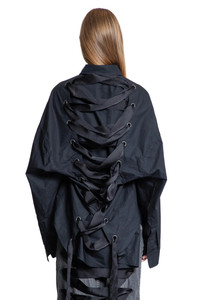 DESCRIPTION - Black - Regenerative cotton poplin - Classic collar - Button closure - Dropped shoulders - Long sleeves - Buttoned cuffs - Lace-up back - Curved hem - Regular fit DETAILS - Made in: Italy - Composition: 100% Cotton - Model code: 831657TRM28 1000 - Item ID: 9612587663702 SIZE & FIT Model wears size 38 Model Height 174 cm Bust 78 cm Waist 60 cm Hips 86 cm