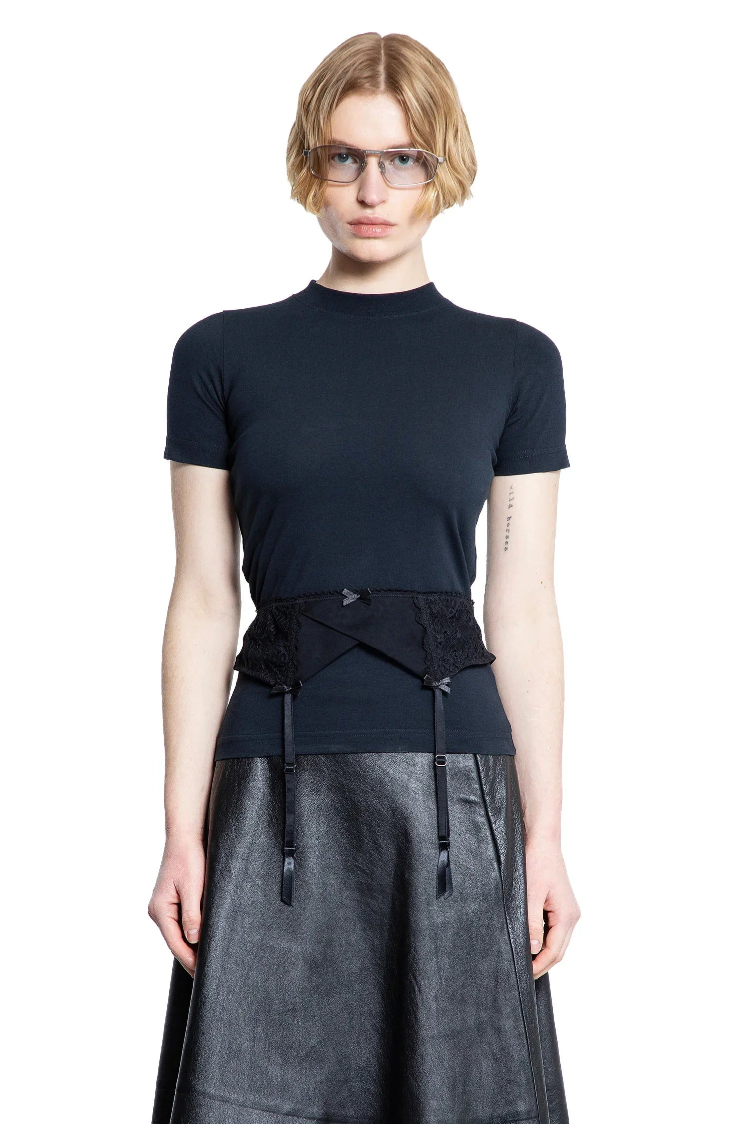 DESCRIPTION - Faded black - Peeling stretch jersey - Round neck - Short sleeves - Lace bra hem overlay - Fitted DETAILS - Made in: Italy - Composition: 100% Cotton Lace: 57% Polyamide 23% Viscose 20% Elastane - Model code: 828869TNVB2 1083 - Item ID: 9541125603670 SIZE & FIT Model wears size S Model Height 180 cm Bust 82 cm Waist 60 cm Hips 89 cm