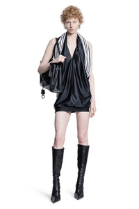 DESCRIPTION - Black - Polyester jersey - Striped trim - V-neck - Self-tie halterneck - Sleeveless - Open back - Gathered hem - Elasticated waistband - Fitted DETAILS - Made in: Italy - Composition: 100% Polyester - Model code: 838791TLV29 1000 - Item ID: 9658595377494 SIZE & FIT Model wears size 36 Model Height 180 cm Bust 82 cm Waist 58 cm Hips 90 cm