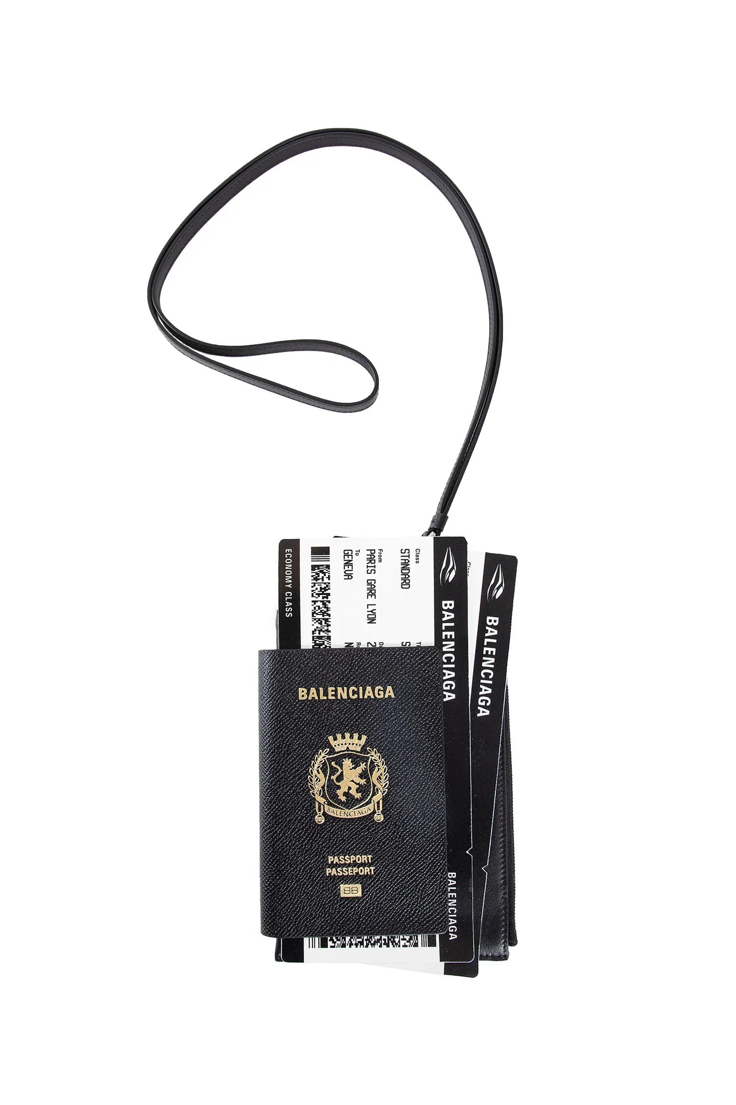 DESCRIPTION - Passport black - Semi matte grained leather - Removable leather strap - Front logo print - Trompe l'oeil ticket print - Zip closure - Back pocket - 3 internal card slot DETAILS - Made in: Italy - Composition: 100% Calfskin - Model code: 7877332AA3R 1000 - Item ID: 9527363731798