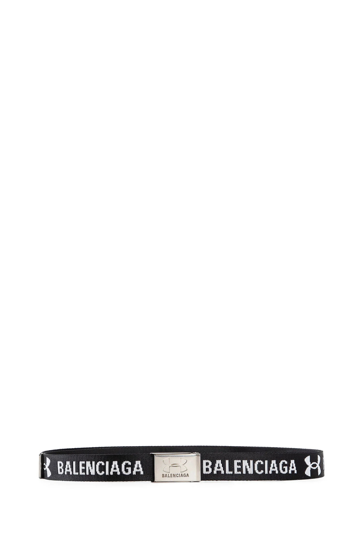 DESCRIPTION - In collaboration with under armour - Black and white - Collaboration logo jacquard webbing - Aged silver-tone collaboration logo buckle - Engraved balenciaga logo tip DETAILS - Made in: Italy - Composition: 100% Polyamide - Model code: 8119062ABJI 1090 - Item ID: 9337913639254
