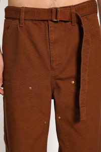 DESCRIPTION - Runway Style - In collaboration with carhartt - Dark beige - Cotton canvas - Belt holes - Adjustable and removable buckled belt - Button and zip closure - Side pockets - Front workwear panels - Side tool strap - Back woven collaboration logo label - Back workwear pockets - Straight leg DETAILS - Made in: Japan - Composition: 100% Cotton - Model code: 2500991S 642 - Item ID: 9821383983446