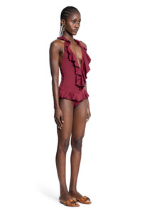 DESCRIPTION - Runway Style - Absolute red - Upcycled polyamide - Ruffled deep V-neck - Ruffled waistband - Front gold-metal logo plate - Back hook-and-eye closure - Open back DETAILS - Made in: Italy - Composition: 100% Polyamide - Model code: CH25UMB19473 611 - Item ID: 9983749816662 SIZE & FIT Model wears size 36 Model Height 176 cm Bust 77 cm Waist 60 cm Hips 87 cm