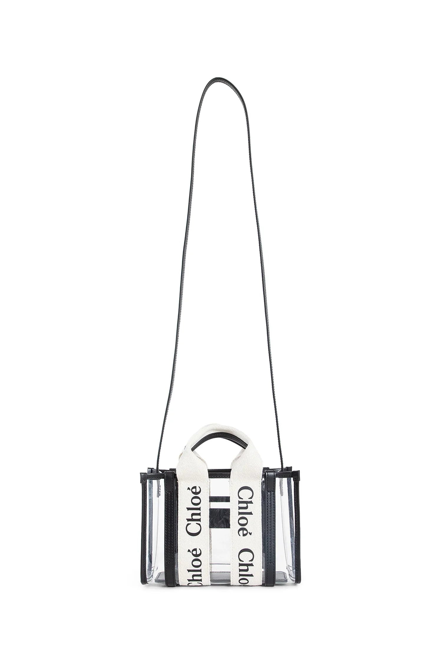 DESCRIPTION - Black - Colorless PVC - Beige leather trim - Logo jacquard webbing top handles - Adjustable and removable leather shoulder strap - Internal slip pocket DETAILS - Made in: Italy - Composition: Leather/Textile/PVC - Model code: CH25UP237P65 101 - Item ID: 9517690552662
