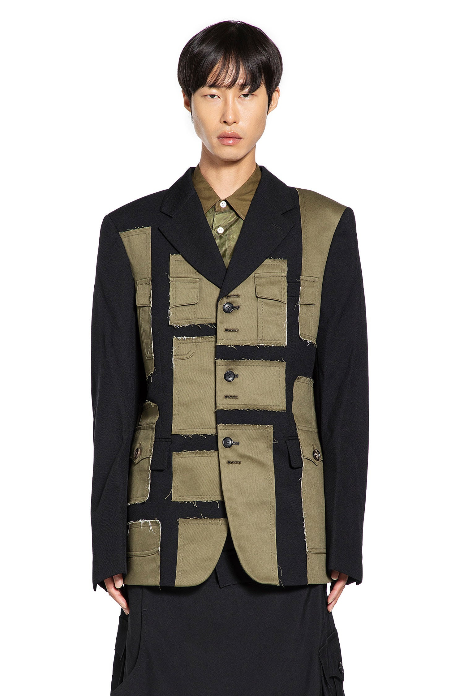 DESCRIPTION - Multicolor - BLACK/KHAKI - Twill - Paneled - Notch lapels - Button closure - Side pockets - Dropped shoulders - Buttoned cuffs DETAILS - Made in: Japan - Composition: 100% Wool - Model code: PPJ012W25 1 - Item ID: 9781992358230 SIZE & FIT Model wears size L Model Height 188 cm Chest 88 cm Waist 69 cm Hips 88 cm