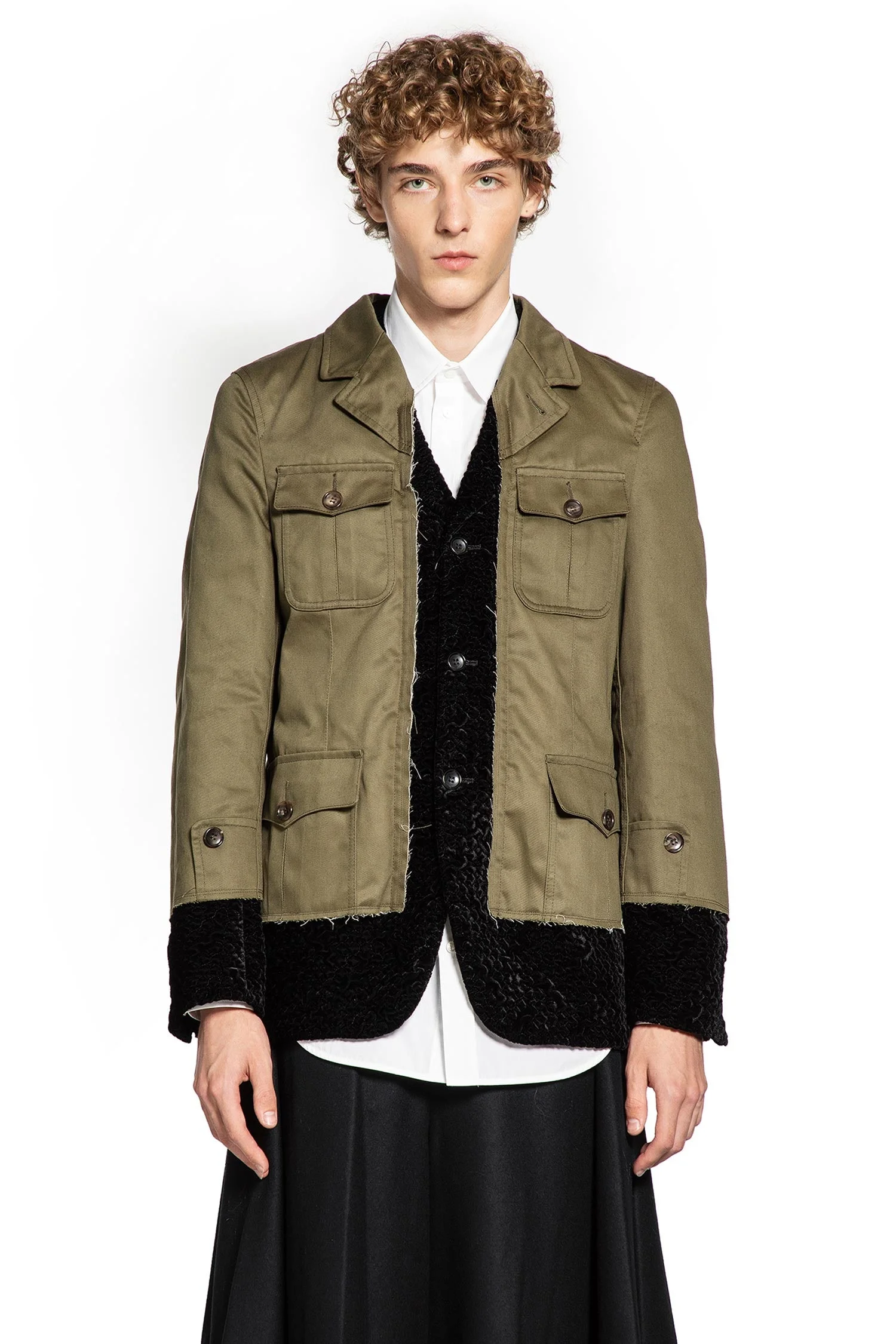 DESCRIPTION - Runway style - Multicolor - Khaki/black - Cotton canvas and velvet - Notched collar - V-neck - Button closure - Button flap chest pockets - Side flap pockets - Buttoned cuffs - Layered hem and cuffs - Regular fit DETAILS - Made in: Japan - Composition: 70% Rayon 30% Polyester 100% Cotton - Model code: PPJ019W25 1 - Item ID: 9837572587862