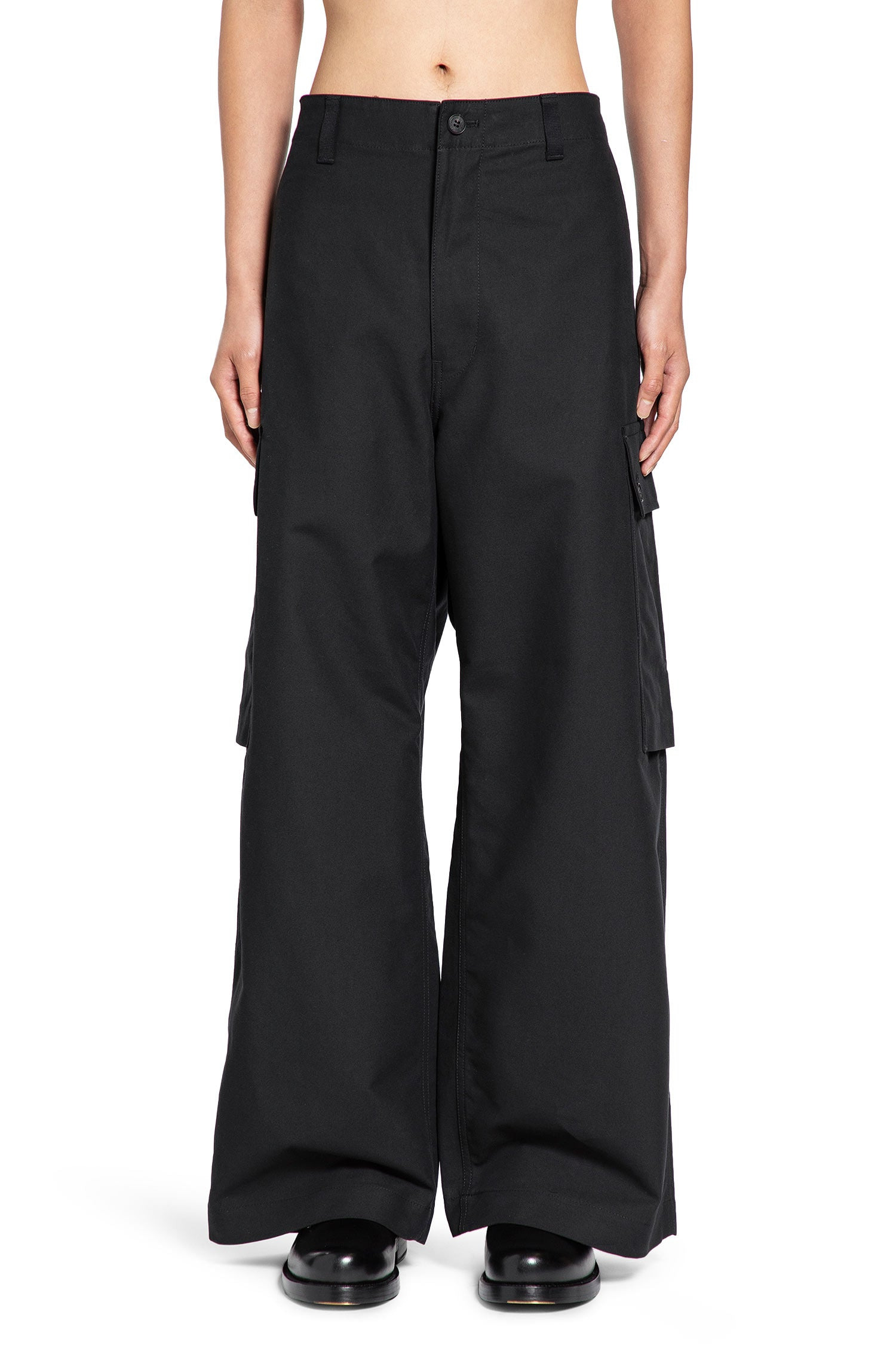 DESCRIPTION - Black - Cotton - Mid-waist - Belt loops - Side 2 cargo pockets - Back 2 flap pockets - Wide leg DETAILS - Made in: Japan - Composition: 100% Cotton - Model code: HPP003W25 1 - Item ID: 9780300644694 SIZE & FIT Model wears size M Model Height 188 cm Chest 88 cm Waist 69 cm Hips 88 cm
