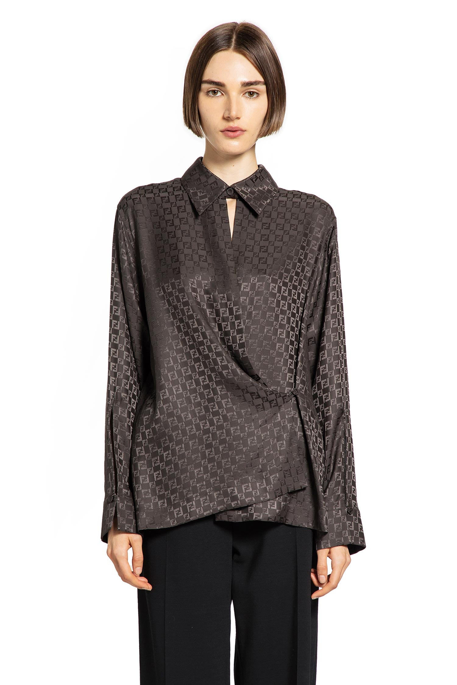 DESCRIPTION - Dark brown - Ff jacquard silk - Classic collar - Front buttoned wrap - Dropped shoulders - Long sleeves - Buttoned cuffs - Straight hem DETAILS - Made in: Italy - Composition: 100% Silk - Model code: FS8287AUQG F1T6H - Item ID: 9852886745430