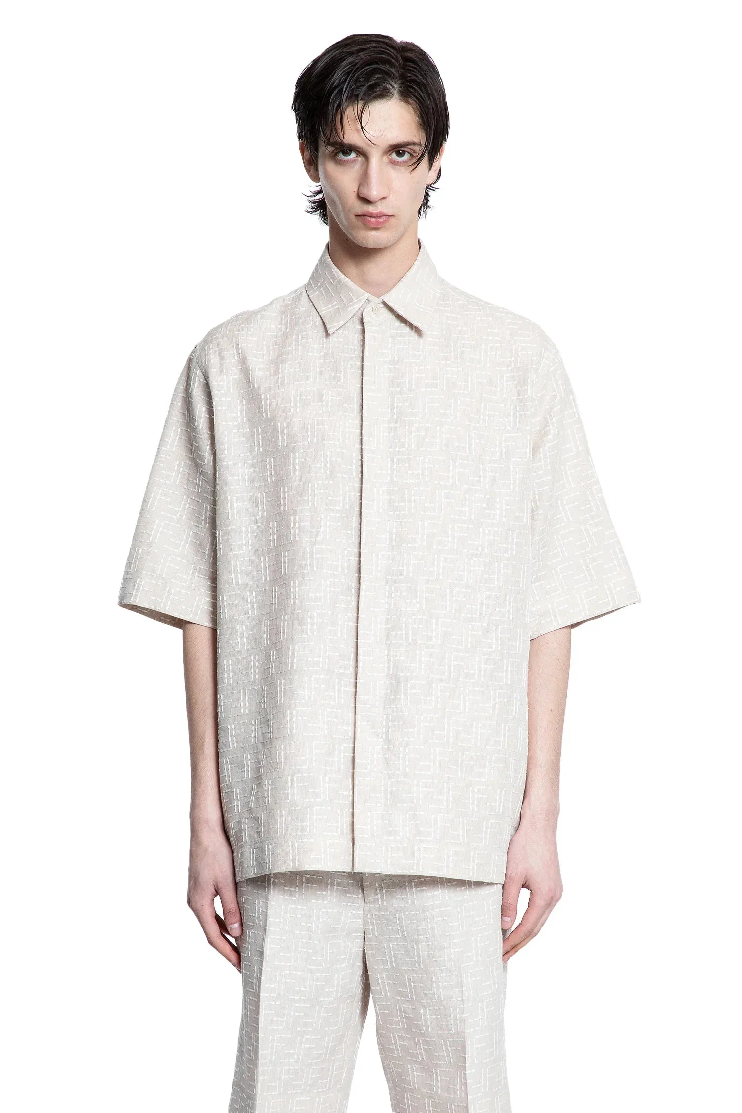 DESCRIPTION - Beige - Ff linen jacquard - Classic collar - Concealed button closure - Dropped shoulders - Short sleeves - Straight hem - Oversized fit DETAILS - Made in: Italy - Composition: 83% Linen 17% Cotton - Model code: FS1317AU6Y F0B9Y - Item ID: 9540168679766 SIZE & FIT Model wears size M Model Height 186 cm Chest 89 cm Waist 72 cm Hips 93 cm