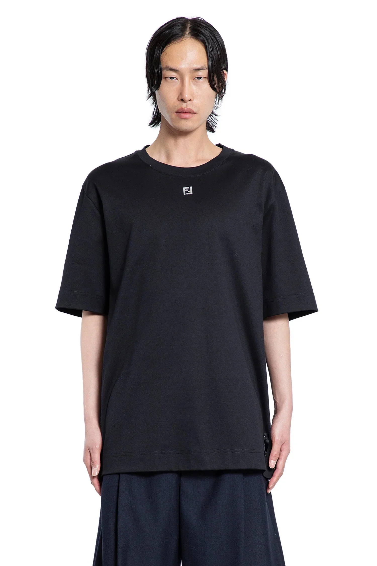 DESCRIPTION - Black - Cotton jersey - Round neck - Front FF plaque - Dropped shoulders - Short sleeves - Loose fit DETAILS - Made in: Italy - Composition: 100% Cotton - Model code: FY0936ARYY F0QA1 - Item ID: 9614763426134 SIZE & FIT Model wears size XL Model Height 188 cm Chest 88 cm Waist 69 cm Hips 88 cm