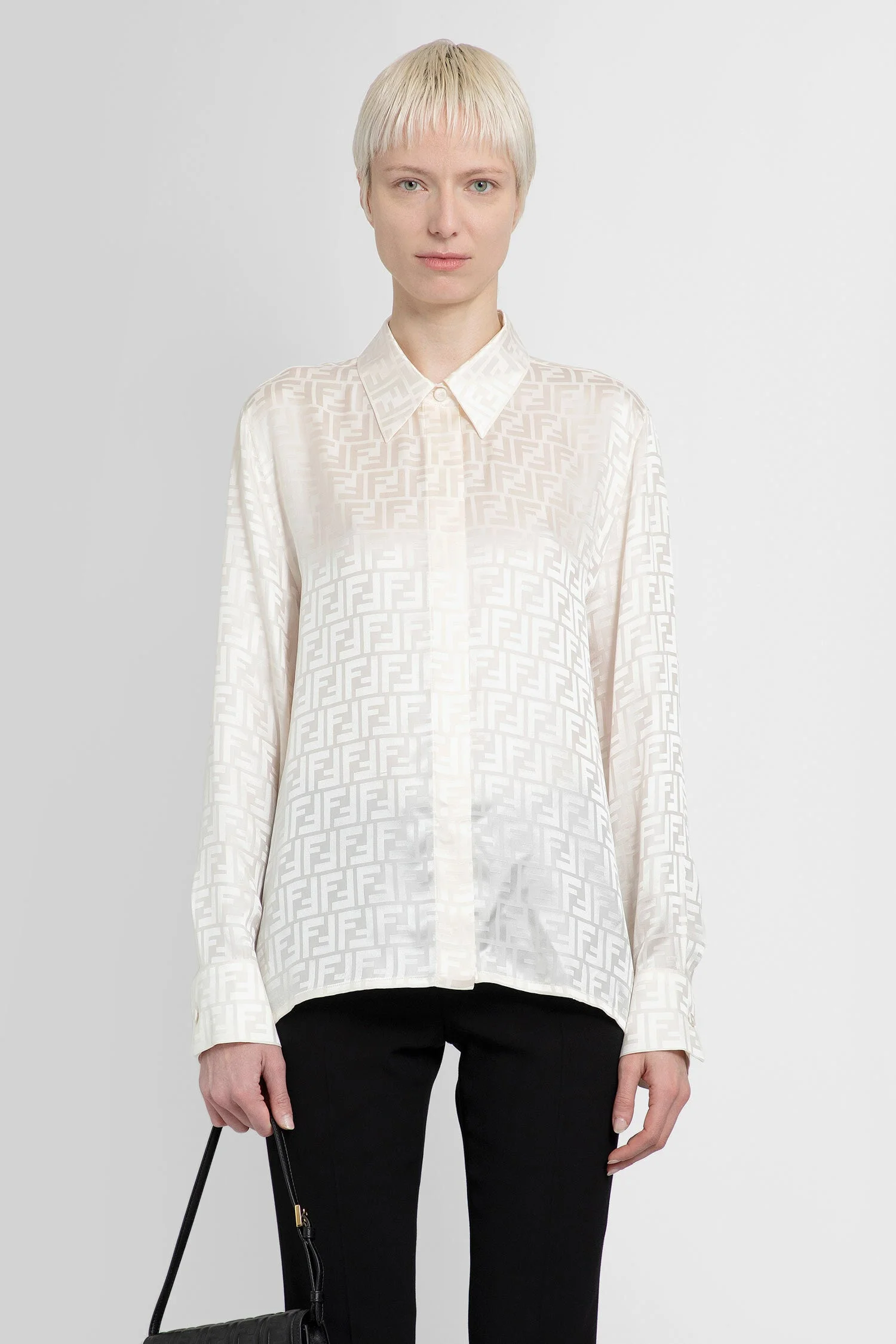 DESCRIPTION - White - FF Jacquard - Silk crepe - Classic collar - Button closure - Long sleeves - Buttoned cuffs - Oversized fit DETAILS - Made in: Italy - Composition: 100% Silk - Model code: FS8140AJ0Z F1M2A - Item ID: 8748392972630 SIZE & FIT Model wears size 42 Model Height 180 cm Bust 80 cm Waist 59 cm Hips 89 cm