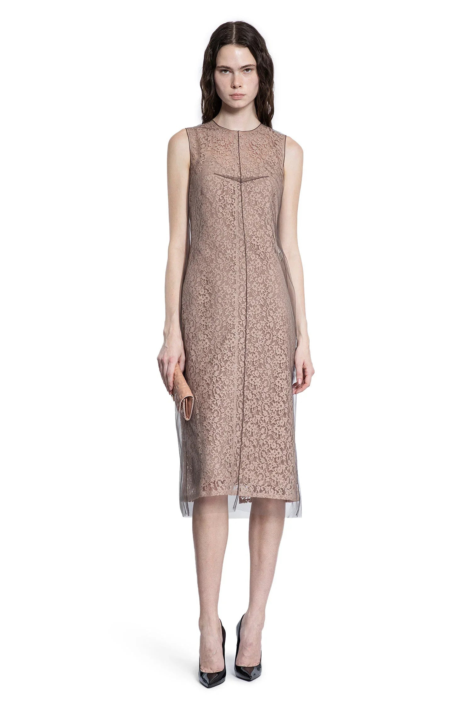 DESCRIPTION - Runway style - Multicolor - Antique pink/brown - Floral lace with tulle overlay - Round neck - Sleeveless - Back teardrop button closure - Back split - Layered overlap hem - Straight fit DETAILS - Made in: Italy - Composition: 80% Cotton 20% Polyamide Lining: 100% Silk - Model code: FDD298AUP7 F1T47 - Item ID: 9517190545750 SIZE & FIT Model wears size 40 Model Height 181 cm Bust 83 cm Waist 57 cm Hips 88 cm