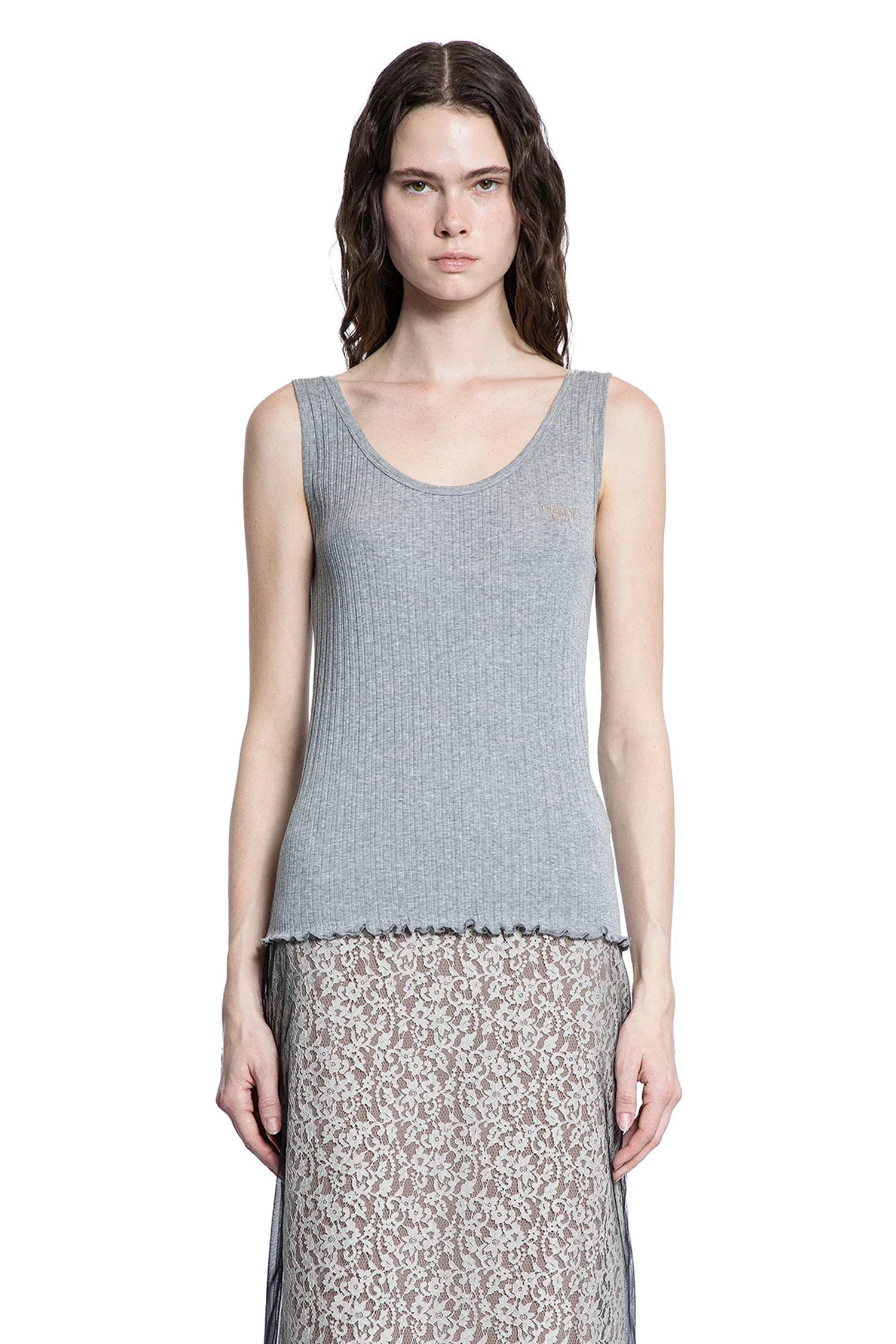 DESCRIPTION - Grey - Ribbed-knit cotton jersey - Scoop neck - Chest fendi roma embroidery - Sleeveless - Scalloped hem and cuffs - Fitted DETAILS - Made in: Italy - Composition: 100% Cotton - Model code: FS9720ASMJ F1RX3 - Item ID: 9517192708438 SIZE & FIT Model wears size S Model Height 181 cm Bust 83 cm Waist 57 cm Hips 88 cm