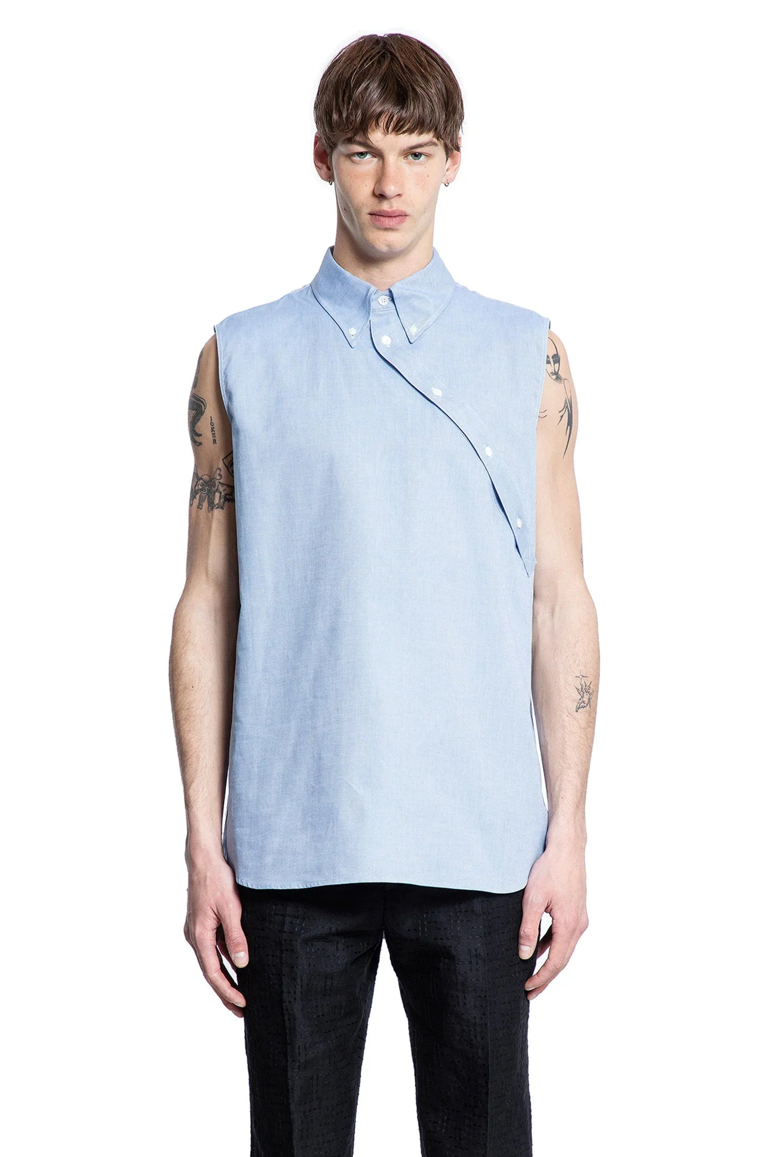 DESCRIPTION - Runway Style - Light blue - Oxford Cotton - button-down collar - Diagonal button closure - Sleeveless - Back fendi roma embroidery - Back internal pleat - Curved hem DETAILS - Made in: Italy - Composition: 100% Cotton - Model code: FS1306AU6W F1QBO - Item ID: 9521884168534 SIZE & FIT Model wears size M Model Height 189 cm Chest 88 cm Waist 69 cm Hips 88 cm