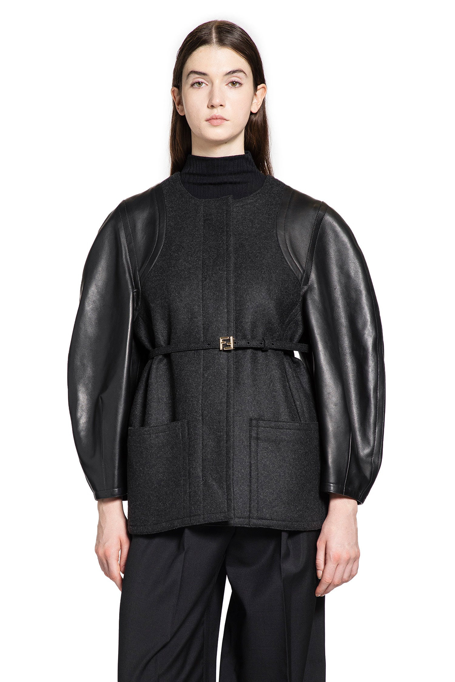 DESCRIPTION - Runway style - Multicolor - Dark grey melange/black - Wool felt and nappa leather - Round neck - Concealed button closure - Side pockets - Adjustable ff buckle belt - Dropped shoulders - Leather sleeves - Cocoon fit DETAILS - Made in: Italy - Composition: 100% Virgin Wool 100% Lambskin - Model code: FJ7650AJ0K F0TAZ - Item ID: 9871475081558