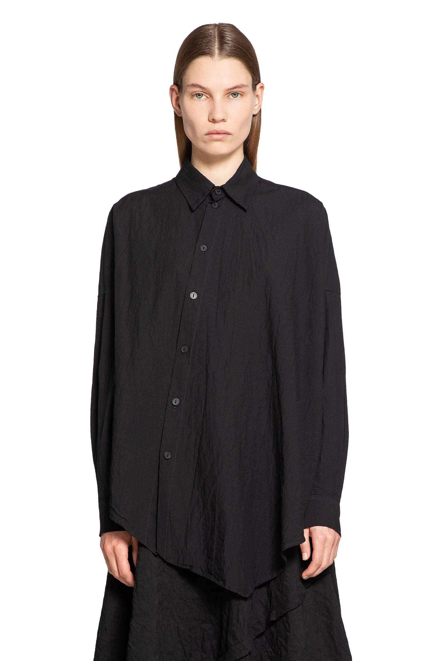 DESCRIPTION - Black - Classic collar - Diagonal button closure - Dropped shoulders - Long pleated sleeves - Buttoned cuffs - Asymmetric hem - Oversized fit DETAILS - Made in: Italy - Composition: 100% Cotton - Model code: DS053FCCB BLACK - Item ID: 9458494996822 SIZE & FIT Model wears size S Model Height 174 cm Bust 78 cm Waist 60 cm Hips 86 cm