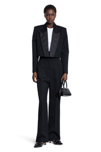 DESCRIPTION - Black - Grain de poudre wool - High-waisted - Hook and zip closure - Leg crease - Side pockets - Side satin stripes - Back pocket - Straight fit DETAILS - Made in: Italy - Composition: 100% Wool. Satin: 70% Silk 30% Polyester. - Model code: BW517Y15CT 001 - Item ID: 9700197564758 SIZE & FIT Model wears size 38 Model Height 180 cm Bust 77 cm Waist 57 cm Hips 87 cm