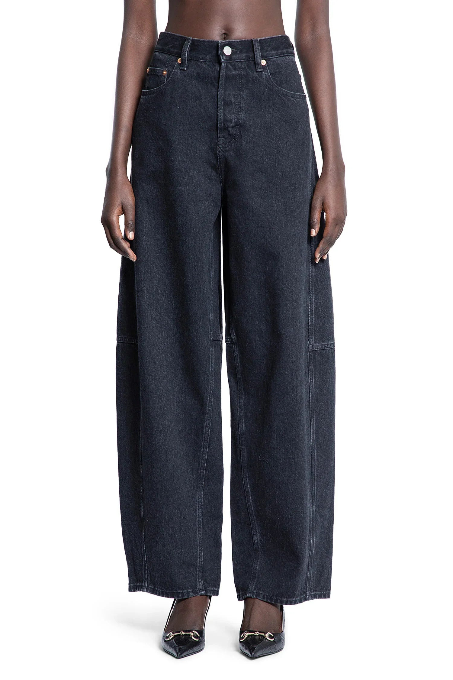 DESCRIPTION - Black - Washed denim - Belt holes - Button closure - 5 pockets - Back naplak logo patch - Curved wide leg - Balloon fit DETAILS - Made in: Italy - Composition: 100% Cotton - Model code: 828601XDDA5 1000 - Item ID: 9484436898134 SIZE & FIT Model wears size 28 Model Height 177 cm Bust 77 cm Waist 59 cm Hips 86 cm