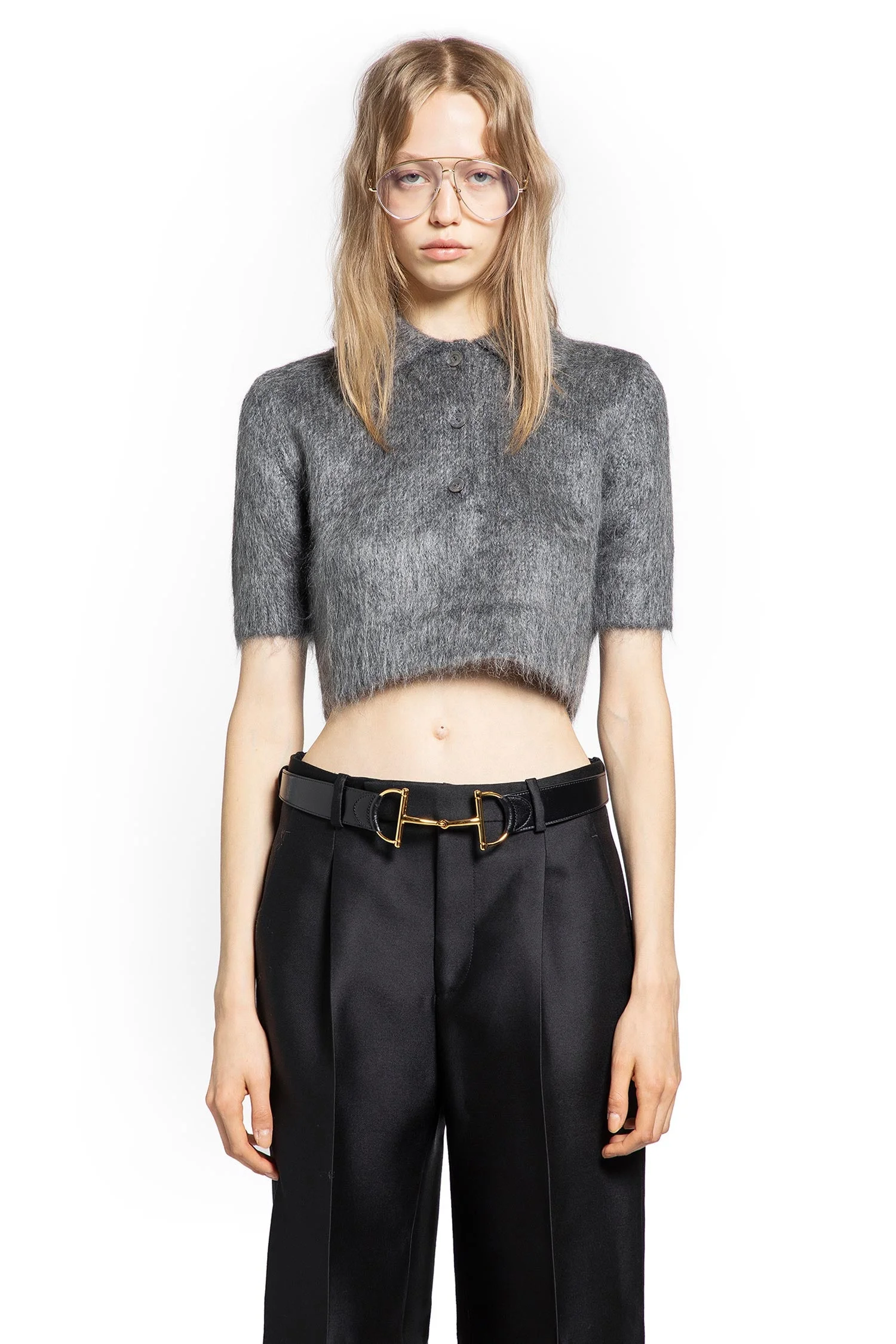 DESCRIPTION - Runway style - Grey - Brushed mohair knit - Collar - Quarter-button closure - Short sleeves - Cropped hem - Fitted DETAILS - Made in: Italy - Composition: 67% Mohair 28% Polyamide 5% Wool - Model code: 836765XKE08 1087 - Item ID: 9926038618454