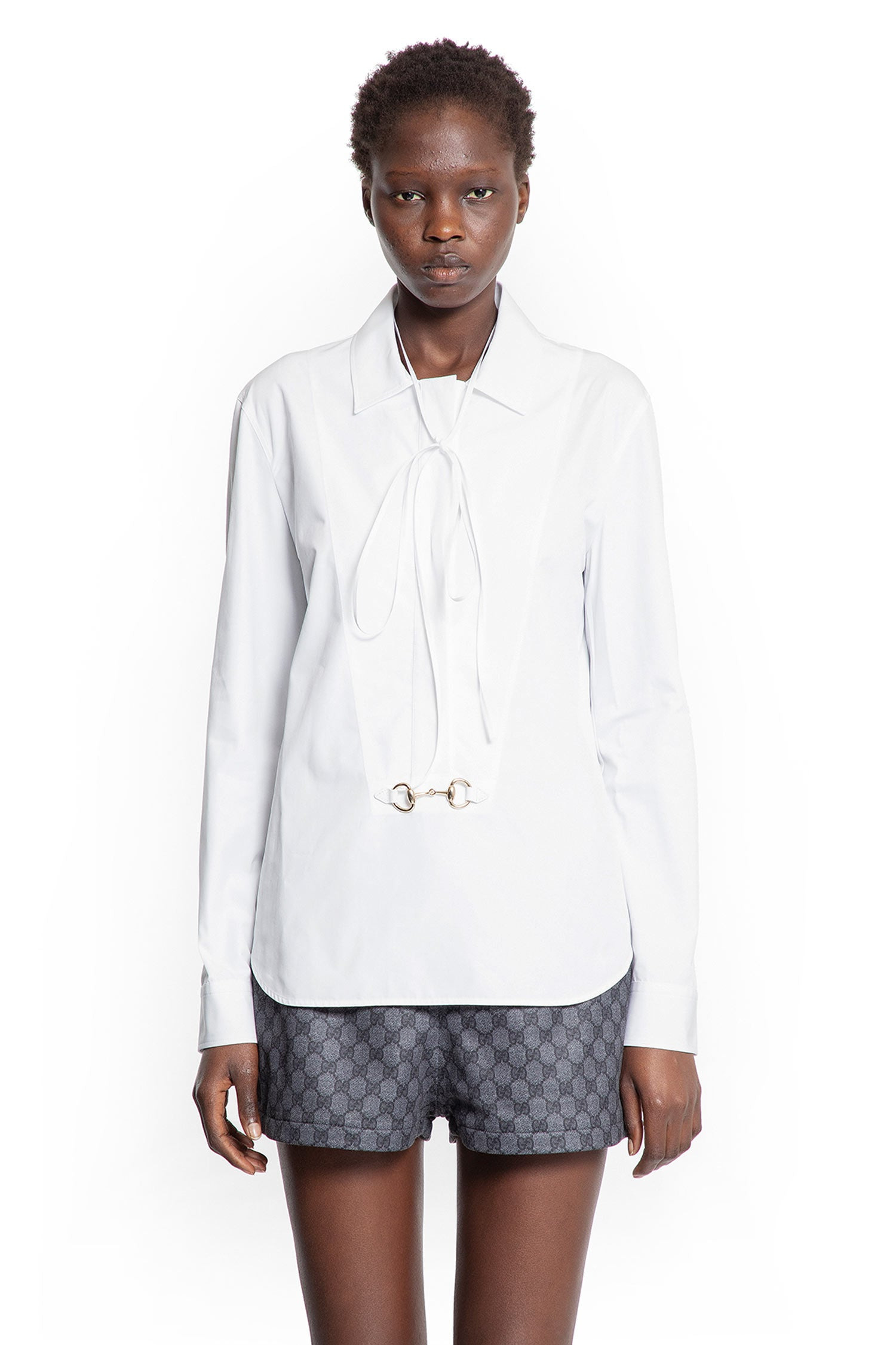 DESCRIPTION - White - Heavy cotton poplin - Classic collar - Concealed half-button closure - Front gold-metal horsebit - Dropped shoulders - Long sleeves - Buttoned cuffs - Curved hem DETAILS - Made in: Italy - Composition: 100% Cotton - Model code: 831912Z8B2P 9000 - Item ID: 9679333654870 SIZE & FIT Model wears size 38 Model Height 180 cm Bust 77 cm Waist 57 cm Hips 87 cm