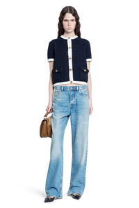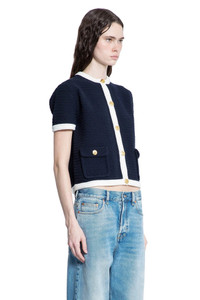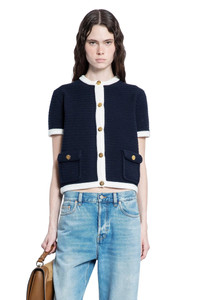 DESCRIPTION - Multicolor - Navy/white - Crochet knit - Crewneck - Gold-metal crest logo button closure - Front button flap pockets - Short sleeves - Cropped hem - Fitted DETAILS - Made in: Italy - Composition: 97% Cotton 2% Polyamide 1% Elastane - Model code: 819373XKEOT 4144 - Item ID: 9511965950294 SIZE & FIT Model wears size S Model Height 181 cm Bust 83 cm Waist 57 cm Hips 88 cm